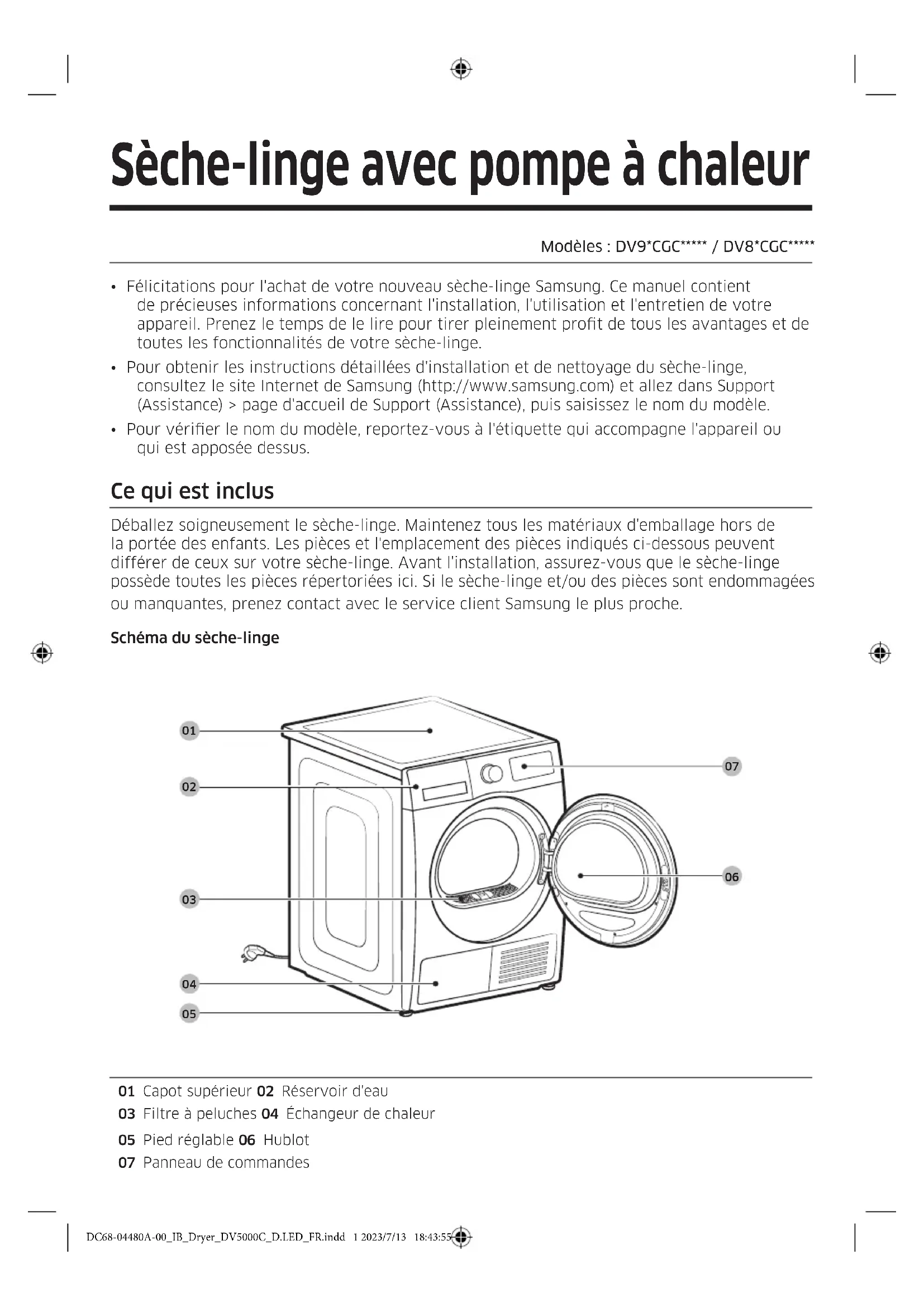 01 Capot supérieur 02 Réservoir d'eau 03 Filtre à peluches 04 Échangeur de chaleur 05 Pied réglable 06 Hublot 07 Panneau de commandes DC68-04480A-00_IB_Dryer_DV5000C_D.LED_FR.indd 1 2023/7/13 18:43:55Français