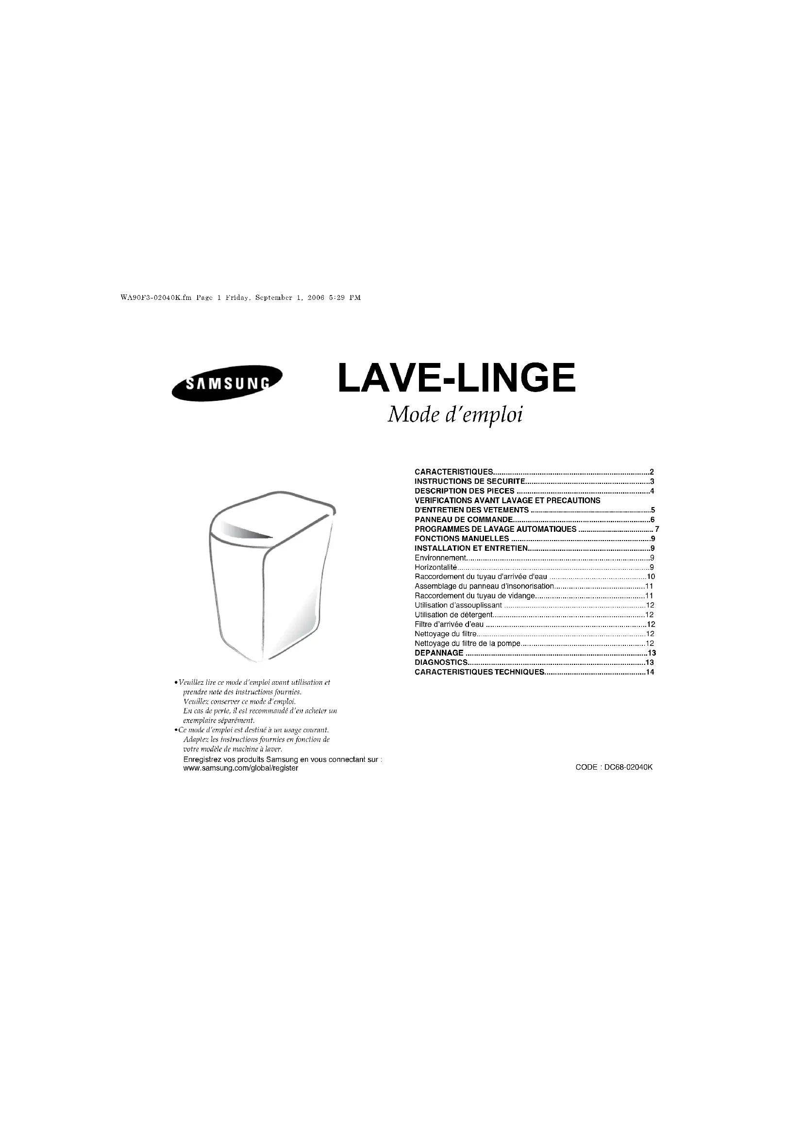 LAVE-LINGE Mode d’emploi Enregistrez vos produits Samsung en vous connectant sur : www.samsung.com/global/register ?)!.3NU 8IOM .ZQLIa ;MX\MUJMZ "! 85- 2 - CARACTERISTIQUES