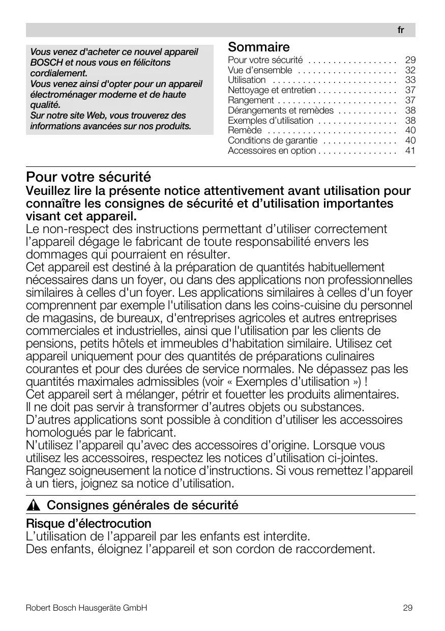 d’entraînement s’éteint mais ne demeure pas dans la position de changement d’outil. Remède Amenez l’interrupteur rotatif sur la position 0 / off. Amenez le bras pivotant sur la position Allumez l’appareil (niveau 1). Éteignez à nouveau l'appareil. L’appareil s'immobilise en position de changement d’accessoire. Dérangement Le mixeur ne démarre pas ou s’arrête pendant l’utilisation. Le moteur « bourdonne ». Les lames sont bloquées. Remède Éteignez l’appareil et débranchez la fiche mâle de la prise de courant. Enlevez le mixeur et retirez l’obstacle. Remettez le mixeur en place. Allumez l’appareil. Remarque importante Si vous n’arrivez pas à résoudre le dérangement, veuillez s.v.p. vous adresser à notre service après-vente. Exemples d’utilisation Crème chantilly 100 g à 600 g Travaillez la crème avec le fouet batteur pendant 1½ à 4 minutes – suivant la quantité et les propriétés de la crème sur la position 7. Blanc d’œuf 1 à 8 blancs d’œufs Travaillez les blancs d’œufs avec le fouet batteur pendant 4 à 6 minutes sur la position 7. Pâte à biscuits oÉÅÉííÉ=ÇÉ=Ä~ëÉ= 2 œufs 2–3 cuillères à soupe d’eau très chaude 100 g de sucre 1 sachet de sucre vanillé 70 g de farine 70 g de fécule éventuellement de la levure chimique Robert Bosch Hausgeräte GmbH