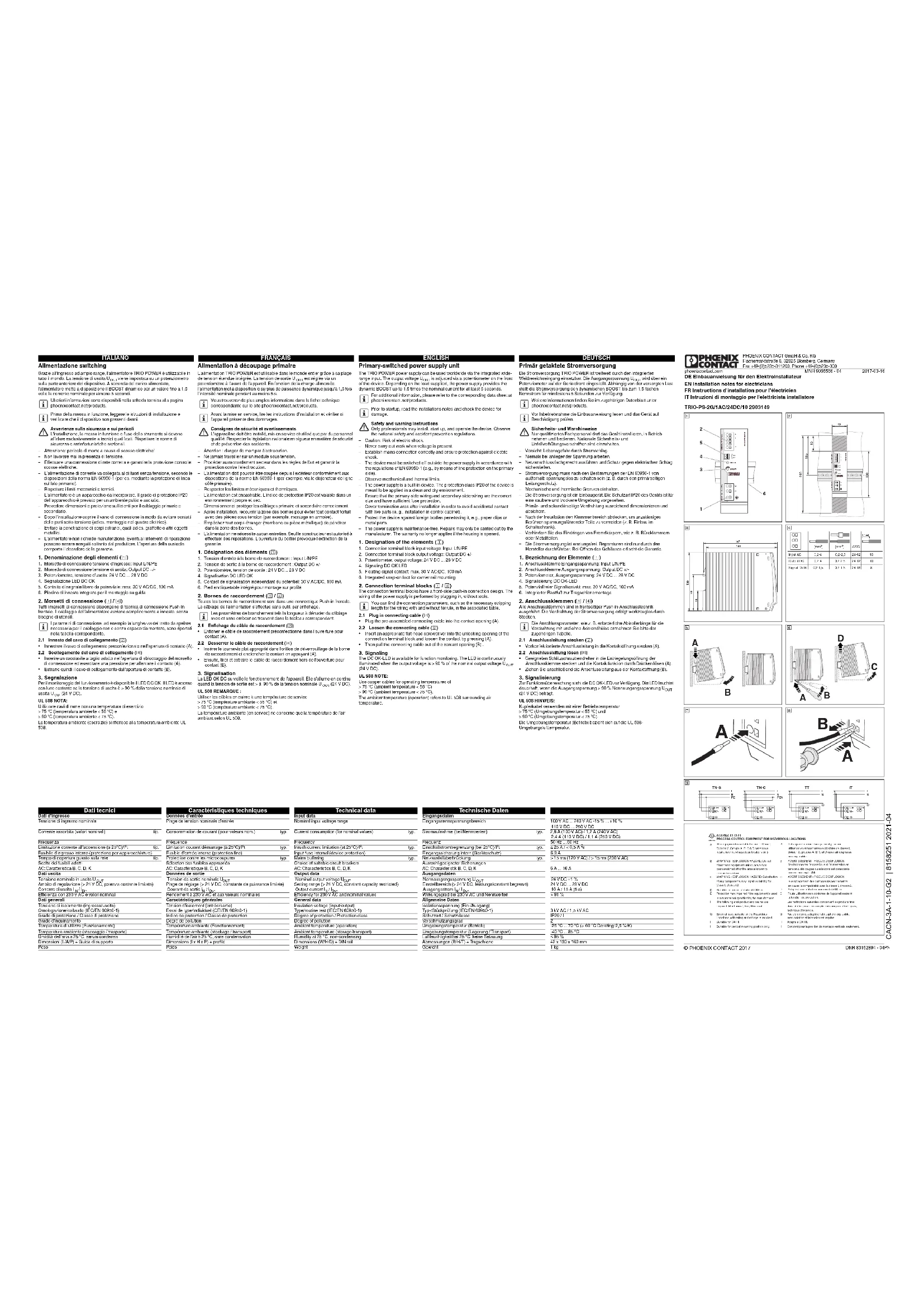 Alimentation à découpage primaire L'alimentation TRIO POWER est utilisable dans le monde entier grâce à sa plage de tension étendue intégrée. La tension de sortie U OUT est réglée via un potentiomètre à l'avant de l'appareil. En fonction de la charge alimentée, l'alimentation met à disposition le surplus de puissance dynamique jusqu'à 1,5 fois l'intensité nominale pendant au moins 5s. – Attention: danger de mort par électrocution. – Ne jamais travailler sur un module sous tension. – Procéder au raccordement secteur dans les règles de l'art et garantir la protection contre l'électrocution. – L'alimentation doit pouvoir être coupée depuis l'extérieur conformément aux dispositions de la norme EN60950-1 (par exemple, via le disjoncteur de ligne côté primaire).– Respecter les limites mécaniques et thermiques.– L'alimentation est encastrable. L'indice de protection IP20 est valable dans un environnement propre et sec.– Dimensionner et protéger les câblages primaire et secondaire correctement. – Après installation, recouvrir la zone des bornes pour éviter tout contact fortuit avec des pièces sous tension (par exemple, montage en armoire). – Empêchez tout corps étranger (trombone ou pièce métallique) de pénétrer dans la zone des bornes. – L'alimentation ne nécessite aucun entretien. Seul le constructeur est autorisé à effectuer des réparations. L'ouverture du boîtier provoque l'extinction de la garantie.