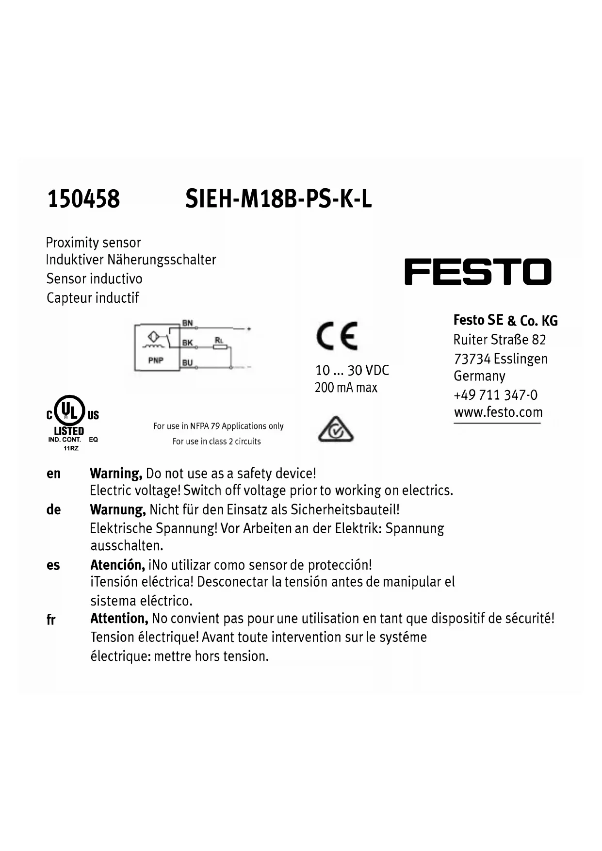 SIEH-M18B-PS-K-L - Capteur Festo - Notice d'utilisation et mode d'emploi gratuit