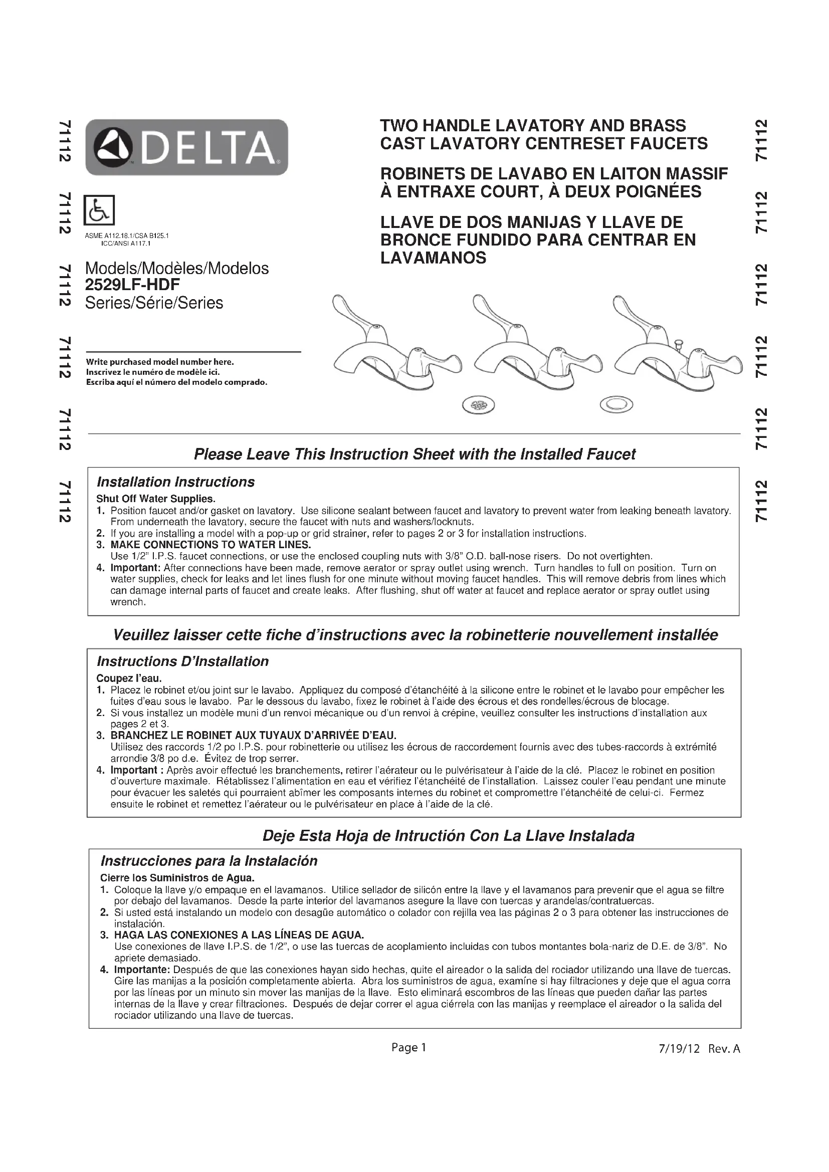 Téléchargez la notice de votre Robinet au format PDF gratuitement ! Retrouvez votre notice 2529LF-HDF - DELTA et reprennez votre appareil électronique en main. Sur cette page sont publiés tous les documents nécessaires à l'utilisation de votre appareil 2529LF-HDF de la marque DELTA.