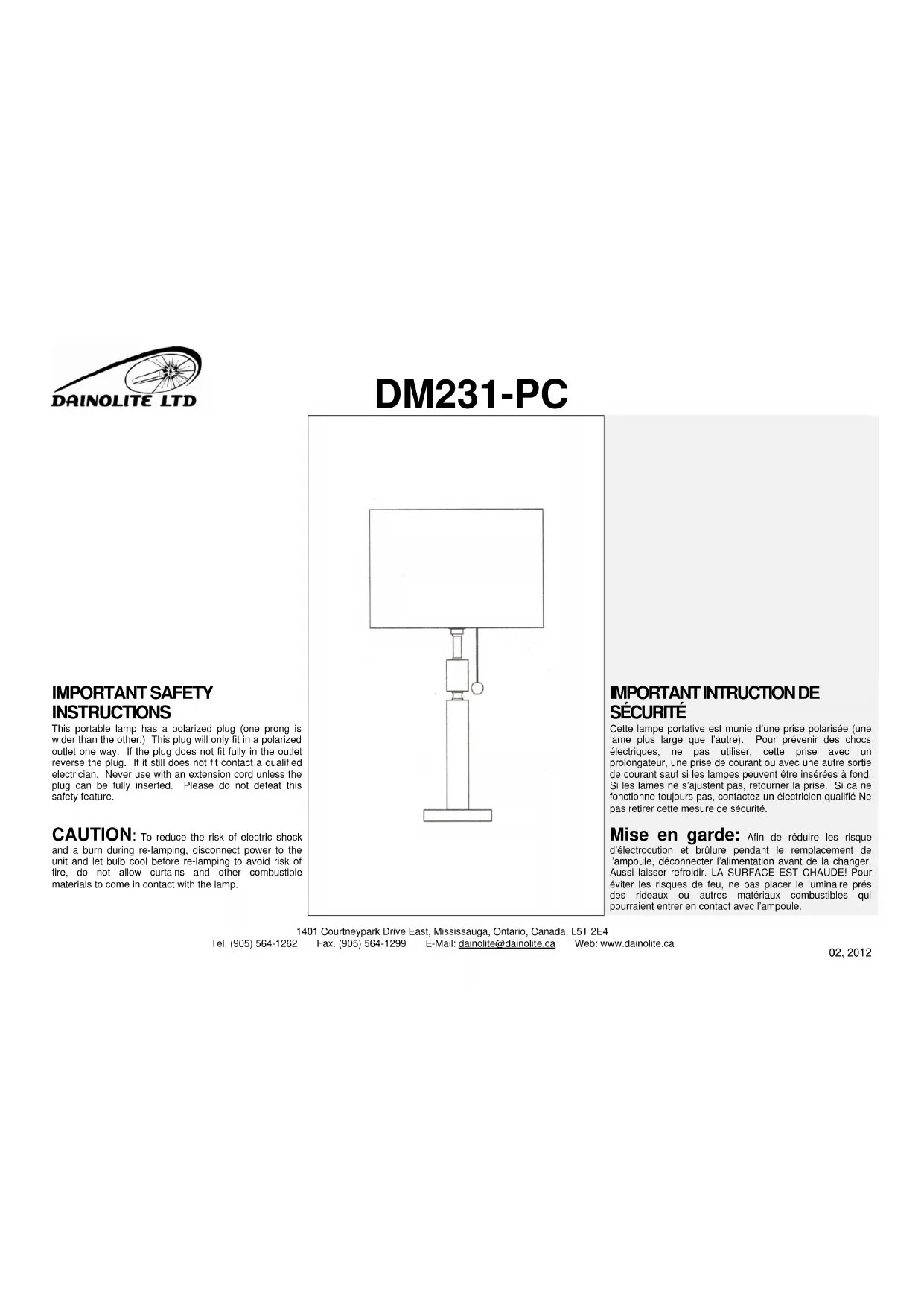SÉCURITÉ Cette lampe portative est munie d’une prise polarisée (une lame plus large que l’autre). Pour prévenir des chocs électriques, ne pas utiliser, cette prise avec un prolongateur, une prise de courant ou avec une autre sortie de courant sauf si les lampes peuvent être insérées à fond. Si les lames ne s’ajustent pas, retourner la prise. Si ca ne fonctionne toujours pas, contactez un électricien qualifié Ne pas retirer cette mesure de sécurité. CAUTION: To reduce the risk of electric shock and a burn during re-lamping, disconnect power to the unit and let bulb cool before re-lamping to avoid risk of fire, do not allow curtains and other combustible materials to come in contact with the lamp. Mise en garde: Afin de réduire les risque d’électrocution et brûlure pendant le remplacement de l’ampoule, déconnecter l’alimentation avant de la changer. Aussi laisser refroidir. LA SURFACE EST CHAUDE! Pour éviter les risques de feu, ne pas placer le luminaire prés des rideaux ou autres matériaux combustibles qui pourraient entrer en contact avec l’ampoule.