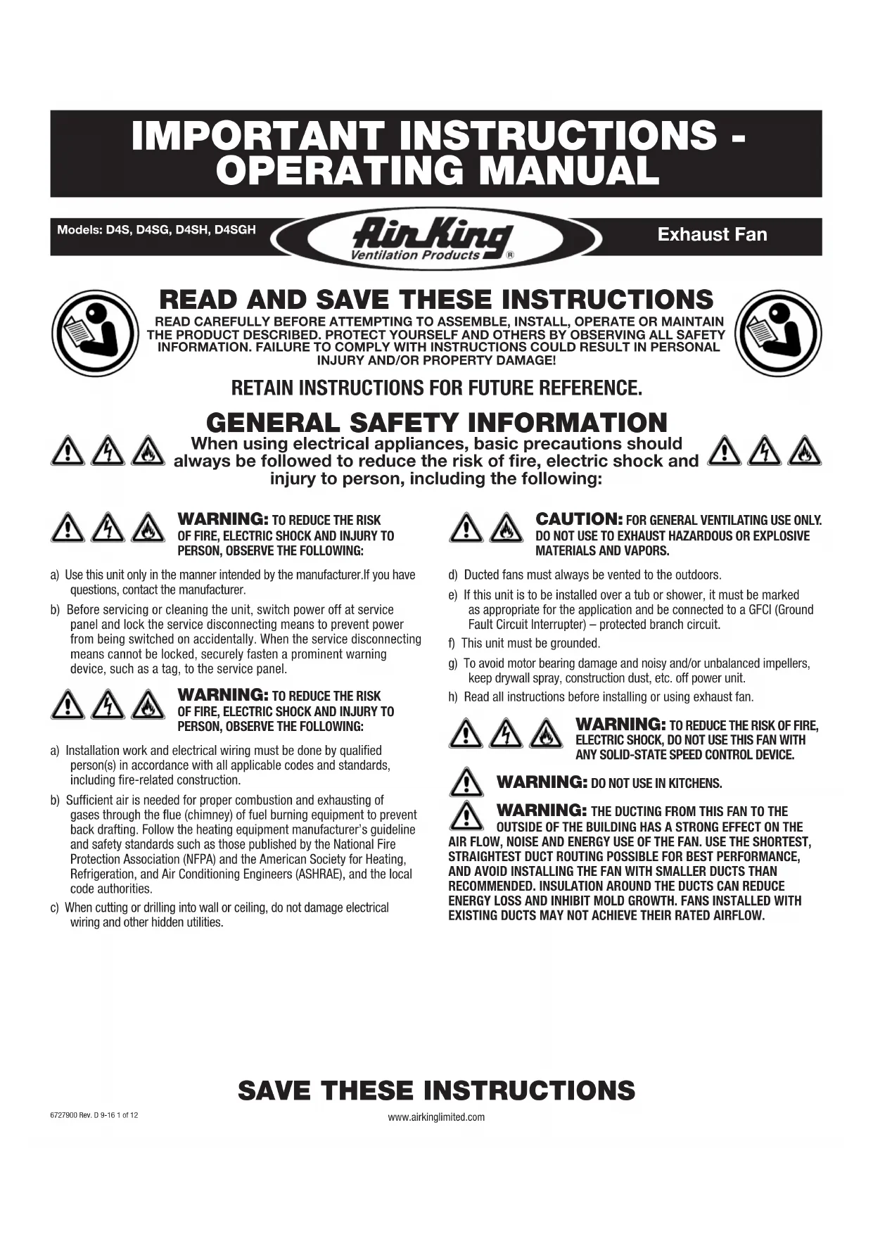 À UN PRODUIT CHIMIQUE [OU À DES PRODUITS CHIMIQUES] CONNU(S) PAR L’ÉTAT DE LA CALIFORNIE POUR CAUSER LA TOXICITÉ ENVERS LES FONCTIONS DE LA REPRODUCTION.www.airkinglimited.com6727900 Rev. D 9-16 11 of 12 Guide de dépannage Trouble Cause Possible Solution Suggérée 1. Le ventilateur ne fonctionne pas lorsque 1a. Un fusible peut être grillé ou un disjoncteur 1a. Remplacer le fusible ou réinitialiser le disjoncteur. l’interrupteur est à la position en marche. peut être décle.nché. 1b. La fiche de raccord du moteur n’est 1b. Couper l’alimentation à l’unité. Retirer la grille et brancher le moteur dans pas connectée. le réceptacle dans le cabinet. Remettre l’alimentation sur l’unité. 1c. Le câblage n’est pas raccordé correctement. 1c. Couper l’alimentation de l’unité. Vérifier que tous les fils sont raccordés. 1d. La moteur est terminee 1d. Remplacez la moteur 2. Le ventilateur fonctionne, mais l’air circule 2. Obstruction dans les conduits d’évacuation. 2. Vérifier pour toute obstruction dans les conduits. Les plus courantes sont plus lentement que la normale. des nids d’oiseau dans le chapeau de toit ou mural là où le ventilateur s’évacue vers l’extérieur. 3. Le ventilateur fonctionne de manière plus 3a. Le moteur est lâche. 3a. Couper l’alimentation à l’unité. Retirer la grille et vérifier que toutes les bruyante que la normale. vis sont complètement serrées. Remettre l’alimentation sur l’unité. 3b. L’hélice du ventilateur frotte contre le cabinet de l’unité. 3b. Appeler votre marchand pour un service. Installateur : Date d’installation : Endroit de l’achat : Numéro de modèle :