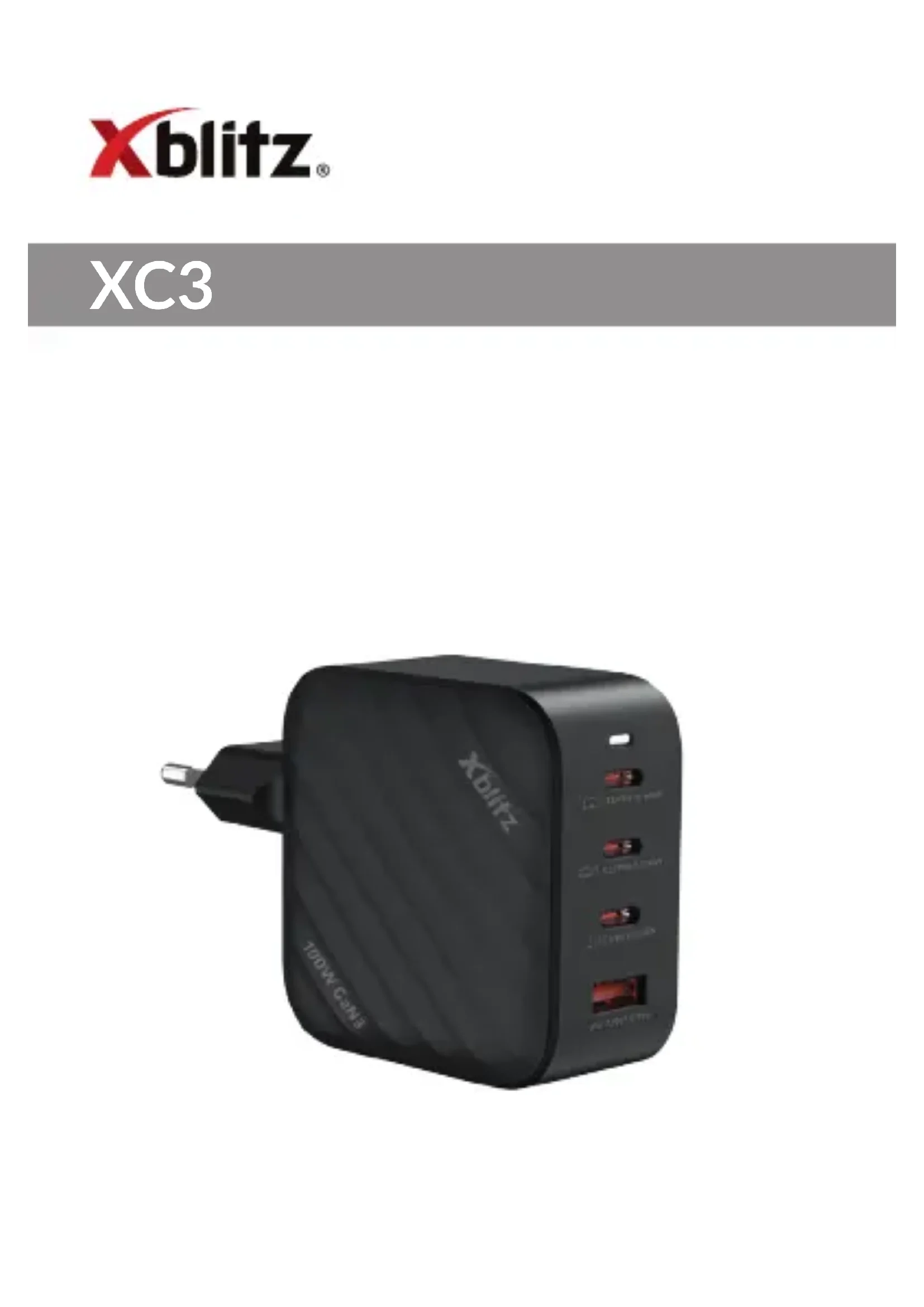 Xblitz XC3 - Chargeur secteur PD100W GaN3 avec foncon de charge rapide Merci d’avoir acheté le chargeur rapide Xblitz XC3. Grâce à la technologie GaN3 et à la disponibilité de 4 ports USB, cet appareil vous permera de recharger rapidement et simultanément de nombreux types d’appareils et d’équipements mobiles. Veuillez lire les instrucons et les précauons ci-jointes avant d’uliserl’appareil an d’éviter tout dommage accidentel à votre équipement ou toute blessure involontaire. Contenu du kit: