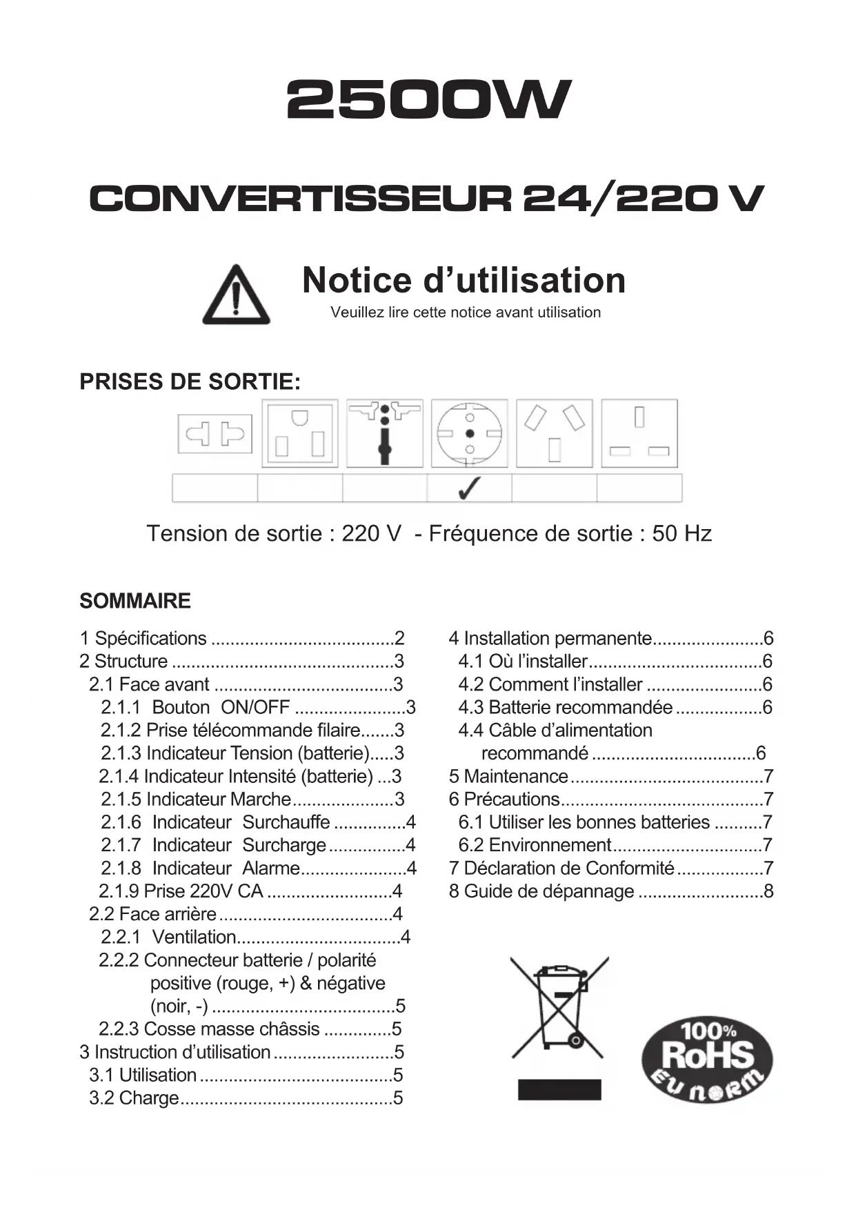 - 3.2 Charge Tension de sortie : 220 V - Fréquence de sortie : 50 Hz2 1 Spécications Puissance de sortie 2500 W en continu 5000 W en pointe Tension d’entrée 20 ~ 30 V Courant d’entrée charge maxi 125 A Tension de sortie (CA) 220 V Forme d’onde de sortie onde sinusoïdale modiée Fréquence de sortie 50 Hz Courant en veille < 0,6 A Rendement 85 ~ 90 % Coupure surtension 31 V ± 0,8 V Alarme batterie faible 21,5 V ± 0,8 V Coupure batterie faible 20 V ± 0,8 V Protection thermique 60 ± 5°C Refroidissement la ventilation se met en marche quand la température atteint 40°C Protection • court-circuit • inversion de polarité p. 5