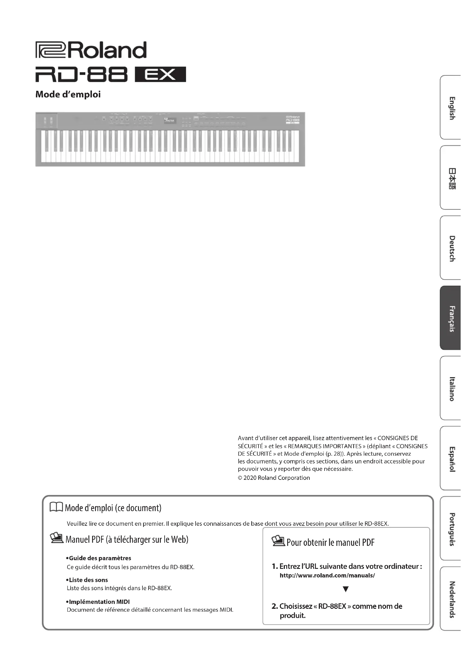 Mode d’emploi (ce document) Veuillez lire ce document en premier. Il explique les connaissances de base dont vous avez besoin pour utiliser le RD-88EX. Manuel PDF (à télécharger sur le Web) 5 Guide des paramètres Ce guide décrit tous les paramètres du RD-88EX. 5 Liste des sons Liste des sons intégrés dans le RD-88EX. 5 Implémentation MIDI Document de référence détaillé concernant les messages MIDI. Pour obtenir le manuel PDF