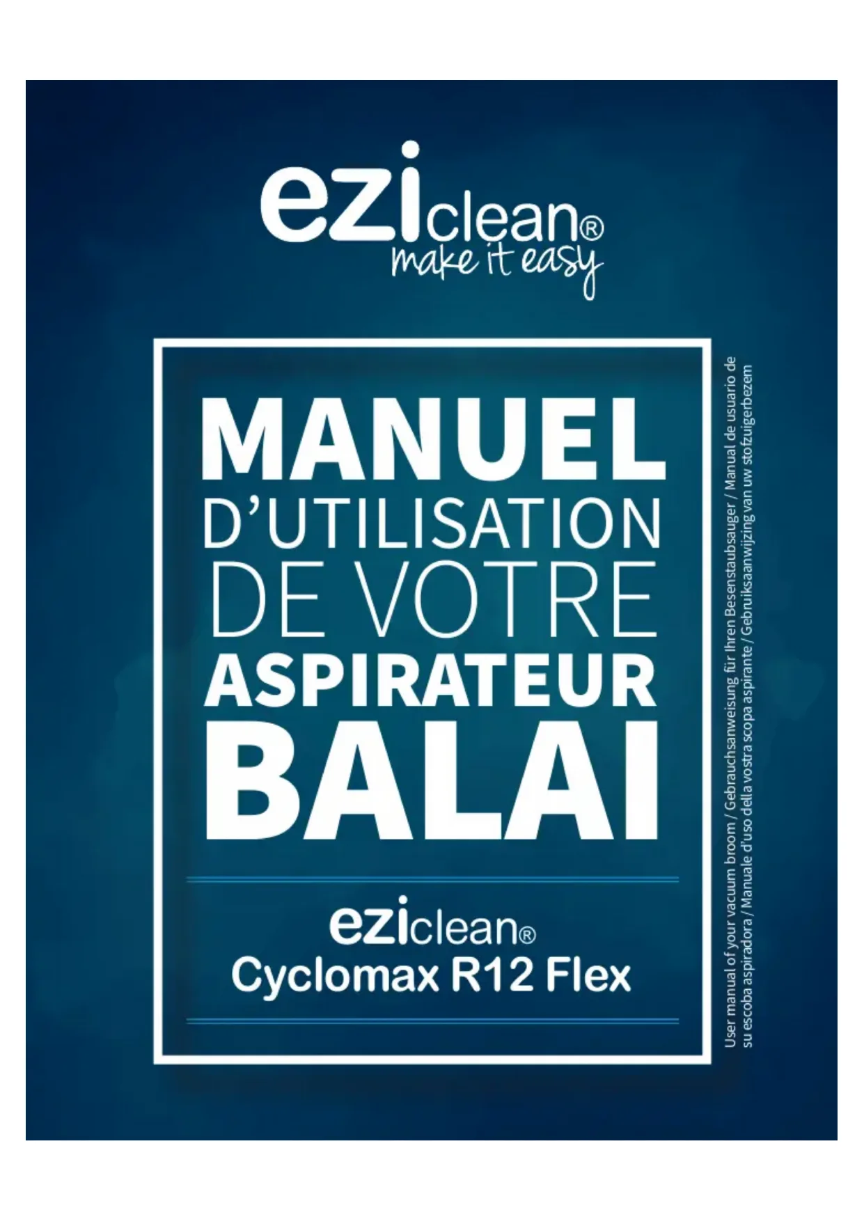 eziclean® Cyclomax R12 Flex MANUEL D’UTILISATION DE VOTRE ASPIRATEUR BALAI User manual of your vacuum broom / Gebrauchsanweisung für Ihren Besenstaubsauger / Manual de usuario de su escoba aspiradora / Manuale d’uso della vostra scopa aspirante / Gebruiksaanwijzing van uw stofzuigerbezem-N’utilisez que les accessoires, consommables ou pièces détachées recommandés ou fournis par EZIclean®. -N’utilisez pas votre appareil à l’extérieur, sur une surface humide ou pour un ramassage humide. -N’aspirez pas d’objets durs ou tranchants, d’allumettes, de cendres chaudes, de mégots de cigarettes ou d’autres objets similaires. - Ne pulvérisez ou n’aspirez pas des liquides inflammables, des produits d’entretien liquides, des aérosols ou leurs vapeurs. -Ne marchez pas sur le cordon d’alimentation lorsque vous utilisez votre appareil et ne débranchez pas la fiche en tirant sur le cordon d’alimentation. - Si votre appareil semble défectueux arrêter immédiatement son utilisation. - Pour assurer l’utilisation sûre et efficace de cet appareil, nous recommandons de n’en confier l’entretien ou les réparations qu’à un réparateur agréé. -Ne marchez pas sur le cordon d’alimentation ou ne l’enroulez pas sur vos bras ou vos jambes quand vous utilisez l’appareil. - Cet appareil ne doit être utilisé que pour un nettoyage domestique, conformément à ce guide d’utilisation. - N’utilisez pas l’appareil sur des personnes ou des animaux. - Cet appareil peut être utilisé par des enfants âgés d’au moins 8 ans et par des personnes ayant des capacités physiques, sensorielles ou mentales réduites, ou n’ayant pas d’expérience ou de connaissances en la matière. Ces dernières doivent recevoir des instructions sur l’utilisation de l’appareil en toute sécurité et comprendre les risques impliqués. - Les enfants ne doivent pas jouer avec l’appareil. -Le nettoyage et l’entretien ne devraient pas être effectués par des enfants sans supervision. - Si le cordon d’alimentation est endommagé, arrêtez immédiatement d’utiliser l’appareil. - Ne confiez l’entretien ou les réparations qu’à un réparateur agréé. - Tenez les mains, pieds, vêtements et cheveux à distance des brosses rotatives. -Cet appareil est fourni avec un chargeur à double isolation pour des prises 230V - Vérifiez que la tension de l’alimentation est la même que celle indiquée sur le chargeur. - L’appareil ne doit pas être branché au secteur lorsque vous retirez les batteries. - Il est normal pour le chargeur de devenir chaud au toucher lorsqu’il est en train de charger. - Ne pas débrancher en tirant sur le cordon d’alimentation. - Ne modifiez jamais le chargeur. - Un cordon endommagé peut créer incendies ou chocs électriques. - Le cordon d’alimentation ne peut être remplacé, le chargeur tout entier doit être remplacé si ce dernier est endommagé. -Débranchez le chargeur en cas d’absence prolongée. - Ne pas prendre le chargeur avec des mains mouillées. - Ne pas exposer la batterie à de fortes températures. Ne pas la ranger près d’une source de chaleur : feux, radiateurs, soleil … - En cas de fuite de la batterie ne pas toucher les liquides, risques de brûlures ou irritations. - Des batteries usées doivent être amenées à un point de recyclage et non pas être éliminées avec les ordures ménagères. Veuillez lire attentivement les informations suivantes avant d’utiliser votre aspirateur ou ses accessoires. Ne démontez pas l’appareil et n’essayez pas de le réparer vous-même. En cas de dysfonctionnement, veuillez contacter votre revendeur pour obtenir les conseils d’un professionnel. Le symbole gurant sur cet appareil indique qu’il ne peut pas être mis au rebut avec les ordures ménagères. Vous devez le déposer dans un centre de recyclage des déchets électriques et électroniques. La mise au rebut doit être effectuée conformément à la réglementation locale en matière de déchets. Pour obtenir des compléments d’information sur le traitement, la récupération et le recyclage de cet appareil, veuillez contacter votre municipalité, le service local d’élimination des ordures ménagères ou le revendeur de l’appareil. FRANÇAIS
