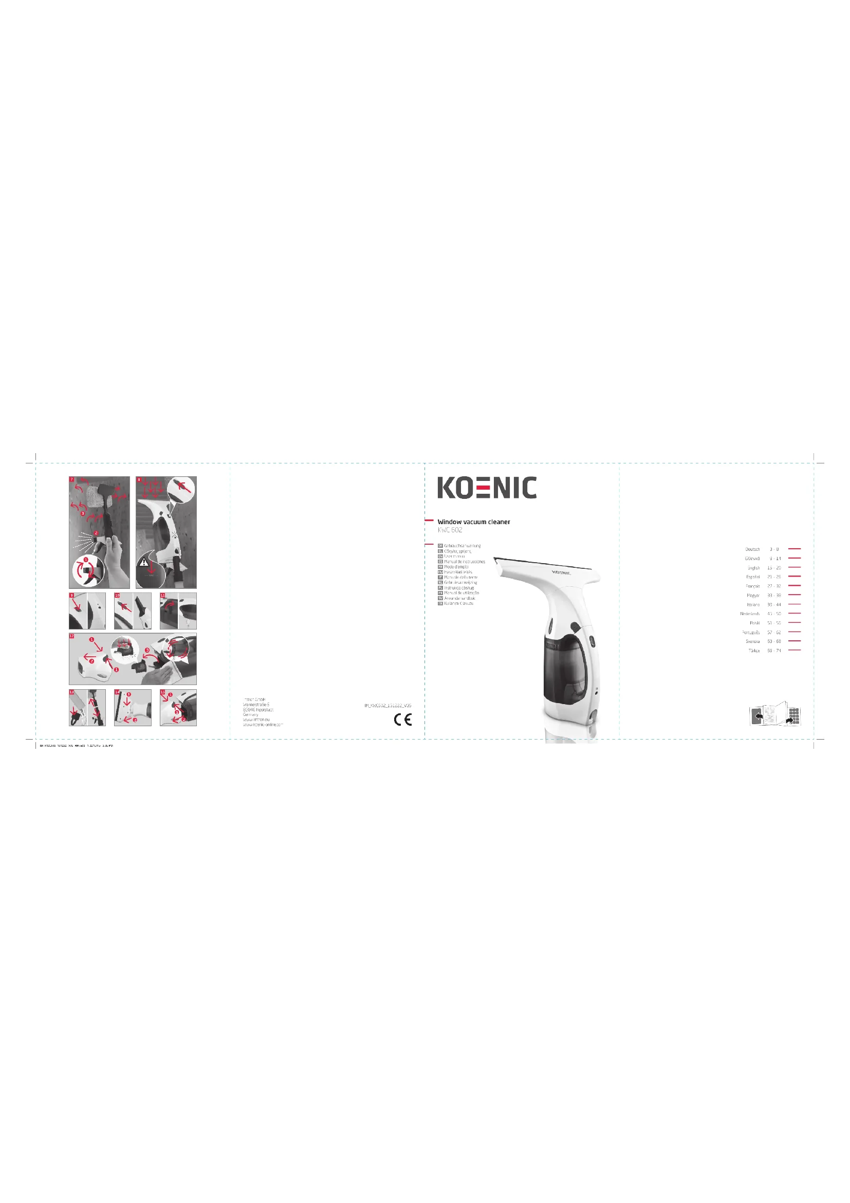 de vapeur vers les yeux. IM_KWC602_151222_V05_HR.indb 28 22/12/15 3:05 PM29 Français Mise au rebut Ne jetez pas cet appareil aux ordures ménagères. Rapportez-le dans un centre de collecte adapté au recyclage des équipements électriques et électroniques. Pour plus d’informations, contactez votre détaillant ou les autorités locales. Jetez les piles en respectant l’environnement. Ne jetez pas les piles dans les ordures ménagères. Rapportezles dans un centre de collecte local ou contactez le revendeur où vous avez acheté ce produit. Contenu 1 X Aspirateur à vitres avec batterie intégrée 2 X Accessoires pour aspirateur 1 X Buse de pulverisation 1 X Fixation de la buse 1 X Filtre à poussière 1 X Tissu en microfibre 1 X Adaptateur Donnees techniques Adaptateur Entrée : 100 à 240 V~, 50/60 Hz Sortie : 5,0 V , 1,0 A Fabricant : Xiamen Innov Electronics Tech Co., Ltd. Modèle : IVP0500-1000 W Classe de protection : II Unité principale Entree (Charger la batterie) : 5 V Puissance d’entrée nominal : 12 W Tension de fonctionnement : batteries au lithium, de batterie 3,7 V 2000 mAh*2 Durée de fonctionnement : 1 heure des batteries (batteries entièrement chargées) Temps de chargement : 6 heures avec batteries vides Degré de protection : IPX4 Capacité : 180 ml Félicitations! Merci d’avoir acheté un produit KOENIC. Veuillez lire soigneusement ce manuel et le conserver pour une consultation future. Utilisation recommandee Le produit est destiné à être utilisé pour racler et aspirer simultanément l’eau des surfaces lisses telles que les fenêtres, les tuiles et les miroirs dans les foyers uniquement. Le produit peut également être utilisé pour aspirer la poussière et la saleté sèches. La société Imtron GmbH décline toute responsabilité pour des dommages au produit, aux biens ou pour des blessures dûs à une négligence ou une manipulation inadéquate du produit, qui ne serait pas conforme aux instructions du fabricant. Avant de l’utiliser pour la premiere fois Retirez soigneusement le produit et les accessoires de leur emballage d’origine. Vérifiez que le contenu est complet et qu’il n’est pas endommagé. Si le contenu livré est incomplet ou endommagé, contactez immédiatement votre revendeur. Le produit est livré avec des batteries non chargées ou faiblement chqrgées. Les batteries doivent être chargées pendant 6 heures avant première utilisation, consultez le chapitre Charger la batterie. IM_KWC602_151222_V05_HR.indb 29 22/12/15 3:05 PM30 Français Liste des pièces