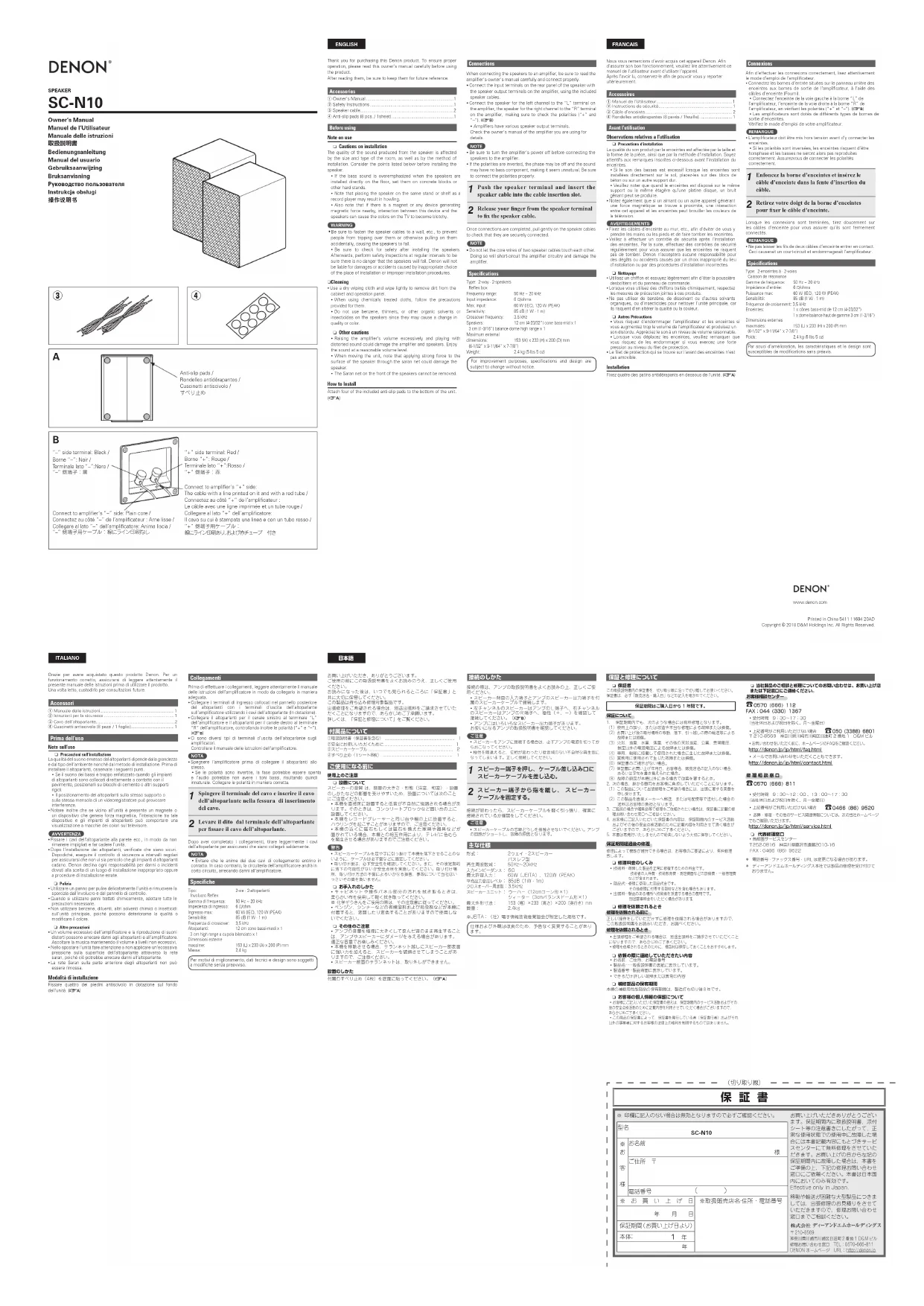 - スピーカーケーブルの芯線どうしを接触させないでください。アンプの回路がショートし、故障の原因となります。 形式: 2ウェイ・2スピーカー バスレフ型再生周波数域: 50Hz〜20kHz入力インピーダンス :6Ω 最大許容入力: 60W(JEITA)、120W(PEAK)平均出力音圧レベル:85dB(1W・1m)クロスオーバー周波数:3.5kHzスピーカーユニット:ウーハ−(12cmコーン形×1) ツィ−タ−(3cmバランスドーム形×1)最大外形寸法:153(幅)×233(高さ)×200(奥行き)mm質量: 2.4kg※JEITA:(社)電子情報技術産業協会が制定した規格です。仕様および外観は改良のため、予告なく変更することがあり Nous vous remercions d’avoir acquis cet appareil Denon. Afind’assurer son bon fonctionnement, veuillez lire attentivement cemanuel de l’utilisateur avant d’utiliser l’appareil.Après l’avoir lu, conservez-le afin de pouvoir vous y reporterultérieurement.Accessoires q Manuel de l’Utilisateur w Instructions de sécurité ............................................................. 1 e Câble d’enceinte 2 r Rondelles antidérapantes (8 pavés / 1feuille). 1 Avant l’utilisationObservations relatives a l’utilisation n Precautions d’installationLa qualité du son produit par le enceintes est affectée par la taille et la forme de la pièce, ainsi que par la méthode d’installation. Soyez attentifs aux remarques inscrites ci-dessous avant l’installation du enceintes. • Si le son des basses est excessif lorsque les enceintes sont installées directement sur le sol, placez-les sur des blocs de béton ou sur un autre support dur. • Veuillez noter que quand le enceintes est disposé sur le même support ou la même étagère qu’une platine disque, un bruit gênant peut se produire.