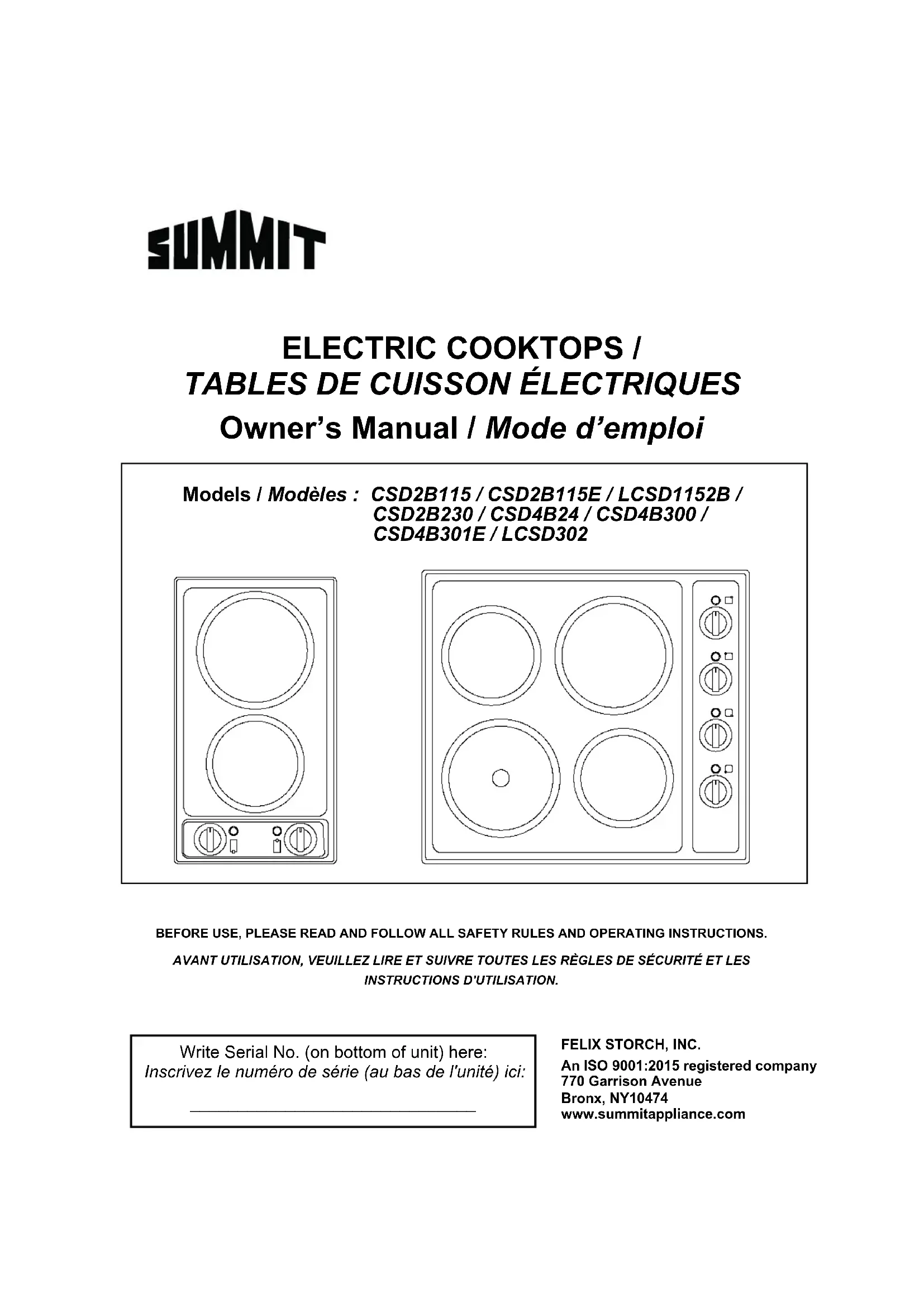 chimiques, y compris le nickel (métallisé), qui est connu de l'État de Californie pour causer le cancer, des anomalies congénitales ou d'autres problèmes de reproduction. Pour plus d'informations, visitez le site www.P65Warnings.ca.gov Remarque : Le nickel est un composant de tout acier inoxydable et d'autres compositions métalliques. FELIX STORCH, INC. 770 Garrison Avenue Bronx, NY10474 Téléphone: (718) 893-3900 Télécopie: (844) 478-8799 www.summitappliance.com Pour commander des pièces et des accessoires, résoudre des problèmes et obtenir des conseils utiles, visitez le site: www.summitappliance.com/support