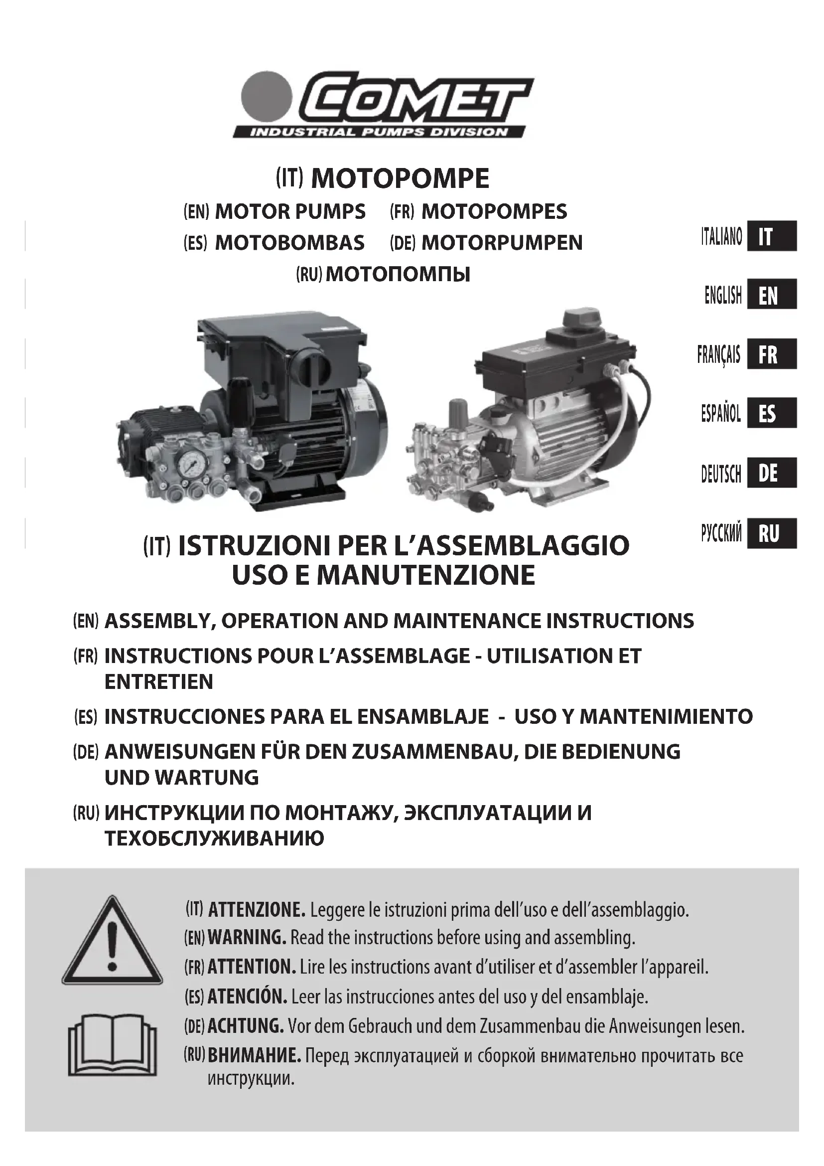 Nous vous recommandons de lire attentivement ce manuel et le manuel de la machine sur laquelle la motopompe est installée: suivre scrupuleusement ce qui est indiqué dans ceux-ci.Veuillez prêter une attention particulière à la lecture des parties de texte signalées par ce symbole: ATTENTION car elles contiennent des consignes de sécurité importantes pour l’utilisation de la motopompe.Le Fabricant décline toute responsabilité quant aux dommages découlant de:• inobservation du contenu du présent manuel et du manuel de la machine sur laquelle la motopompe est installée;• utilisations de la motopompe diérentes de celles exposées au paragraphe