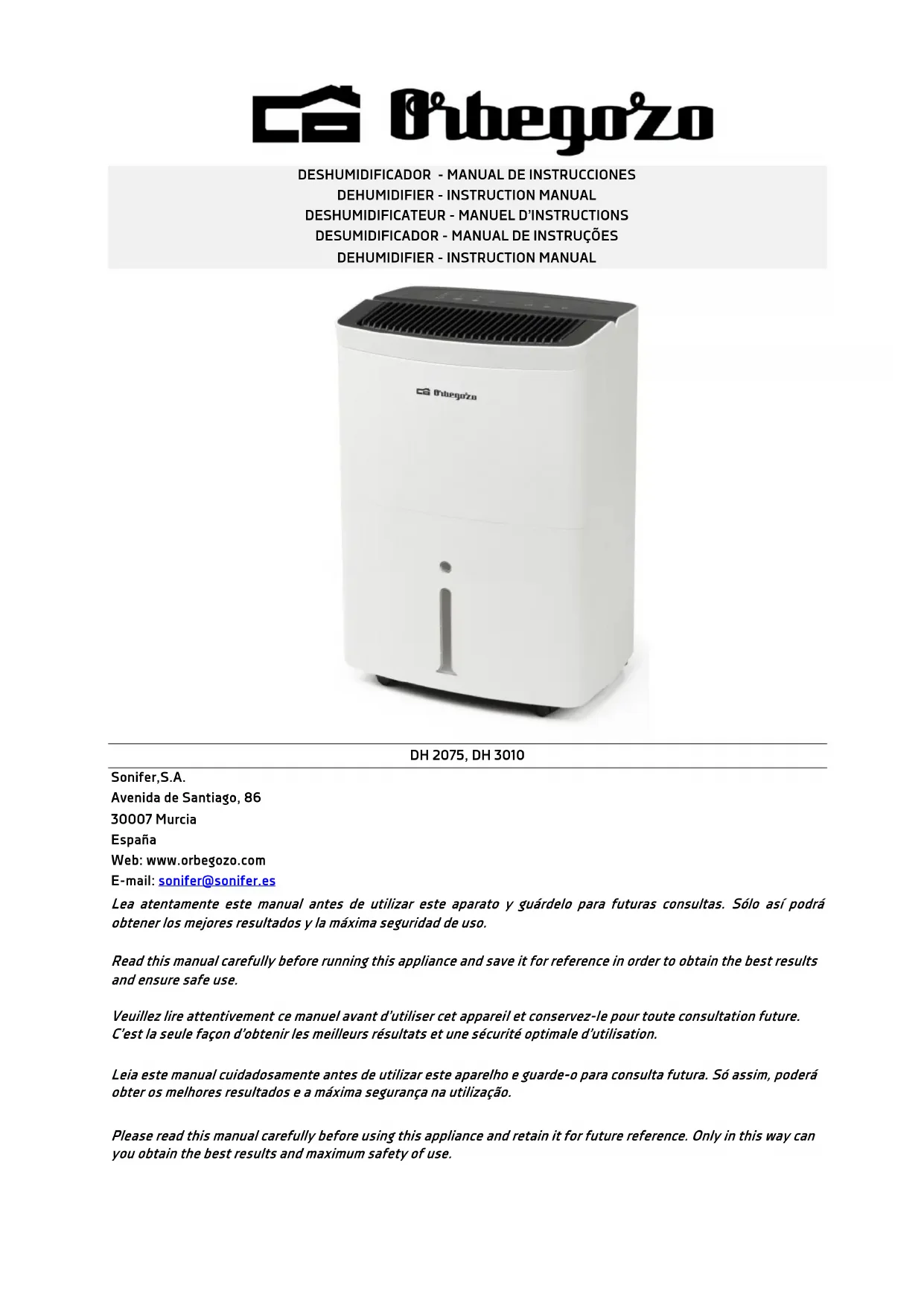 DH 2075 - Déshumidificateur Orbegozo - Notice d'utilisation et mode d'emploi gratuit