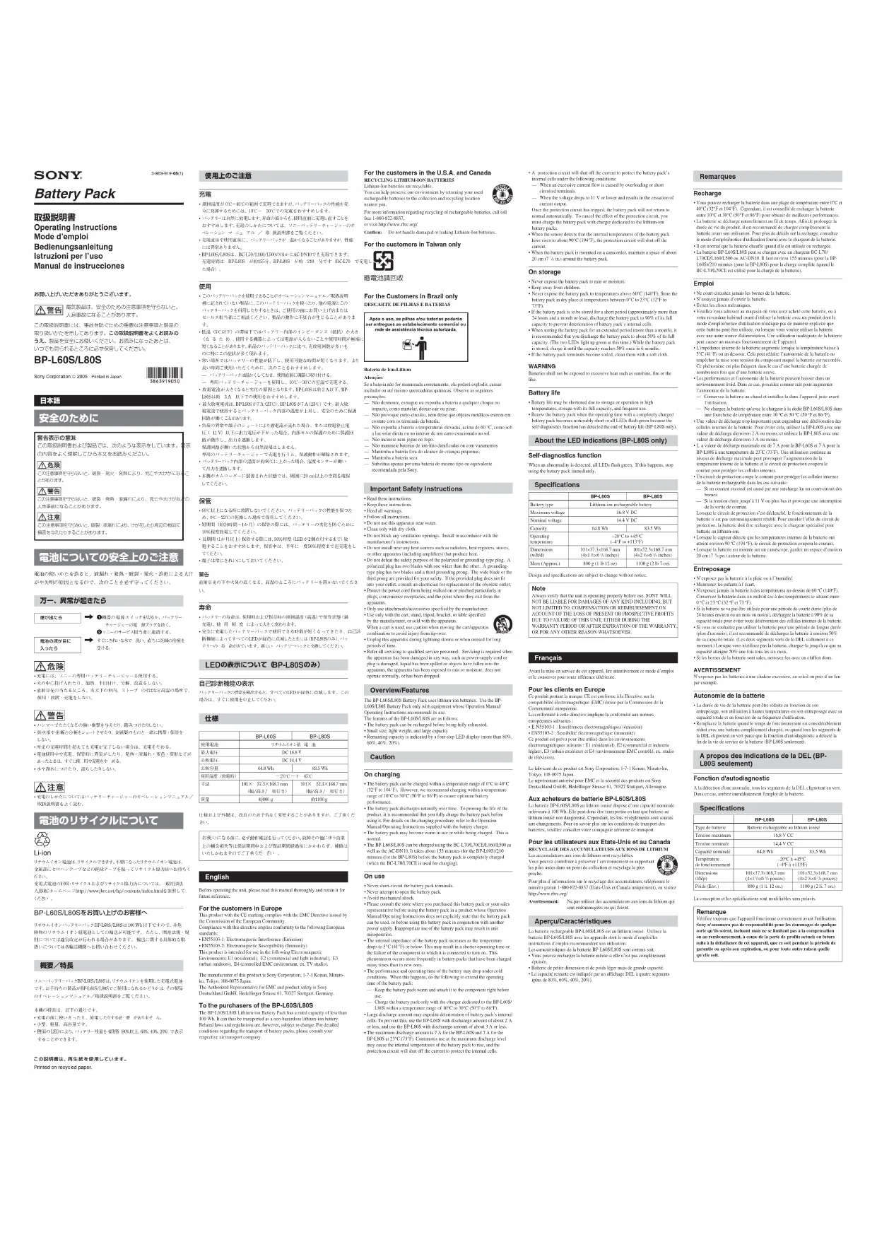 sont endommagées ou qui fuient. Aperçu/Caractéristiques La batterie rechargeable BP-L60S/L80S est au lithium ionisé. Utilisez labatterie BP-L60S/L80S avec les appareils dont le mode d’emploi/lesinstructions d’emploi recommandent son utilisation.Les caractéristiques de la batterie BP-L60S/L80S sont comme suit.• Vous pouvez recharger la batterie même si elle n’est pas complètementépuisée.• Batterie de petite dimension et de poids léger mais de grande capacité.• La capacité restante est indiquée par un affichage DEL à quatre segments(plus de 80%, 60%, 40%, 20%).3-863-919-05(1)煙が出たら電池の液が目に