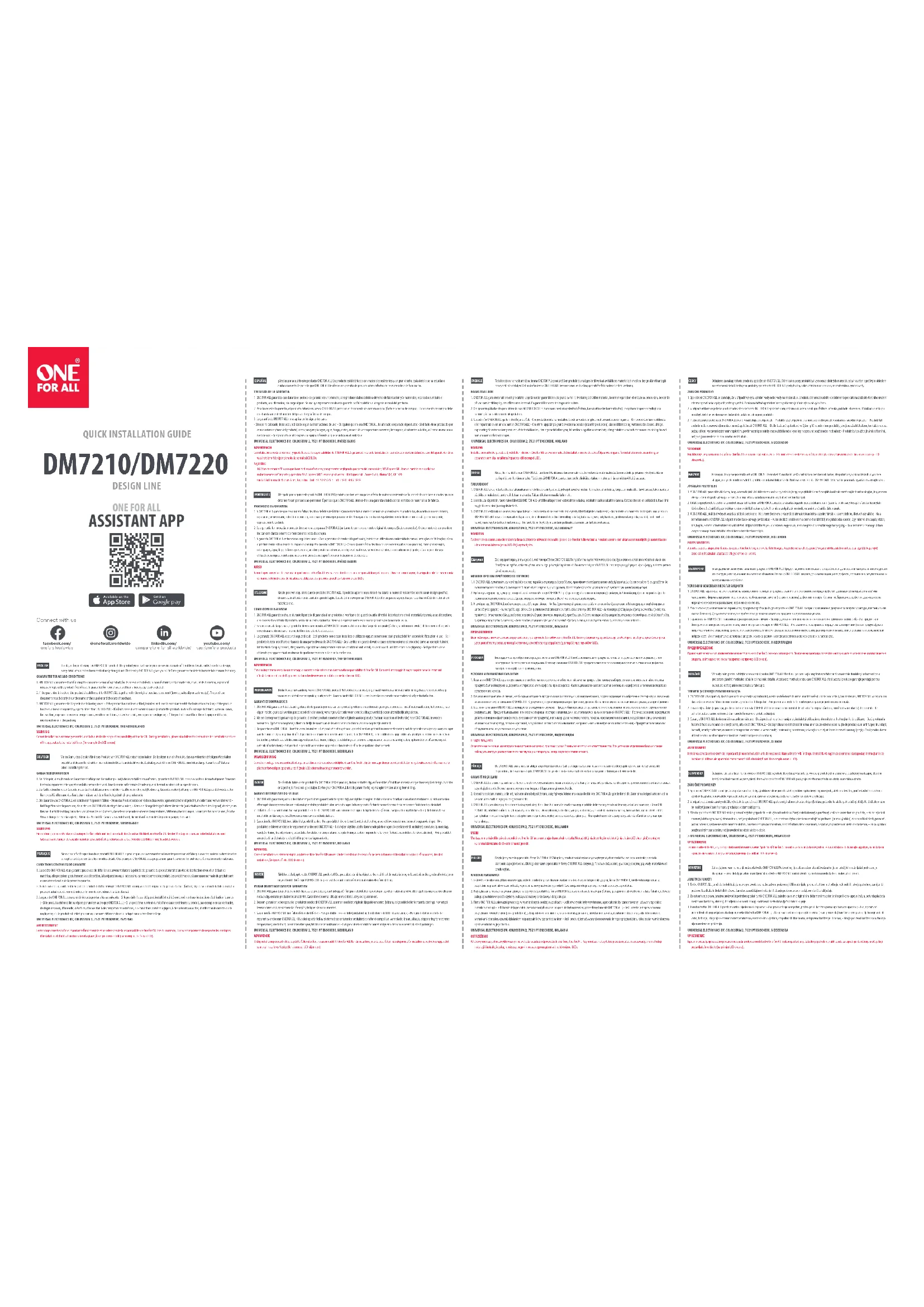 1. La société ONE FOR ALL vous garantit que, en cas de défaillance survenant durant la période de garantie du produit du fait d'un vice de fabrication et/ou d'un défaut de matériau, elle procédera gratuitement, à sa discrétion, à la réparation ou, si nécessaire, au remplacement du produit. Les problèmes dus à une usure normale du produit sont expressément exclus de la présente garantie. 2. Dans le cas où la garantie est invoquée, le produit doit être renvoyé à ONE FOR ALL accompagné de l'original de la preuve d'achat (facture, reçu de vente ou ticket de caisse). La preuve d'achat doit clairement indiquer le nom du revendeur et la date d'achat. 3. La garantie ONE FOR ALL sera considérée caduque dans les cas suivants: - Si le produit n'a pas été percé, installé et utilisé conformément aux instructions d'utilisation fournies ; - Si le produit a été modi é ou réparé par un tiers autre que ONE FOR ALL ; - Si un problème survient du fait d'une cause extérieure au produit, par exemple en cas de foudre, de dégât des eaux, d'incendie, d'éra ure, d'exposition à des températures extrêmes, aux conditions météorologiques, à des solvants ou acides, d'utilisation incorrecte ou de négligence; - Si le produit est utilisé pour un équipement di érent de celui indiqué sur ou dans l'emballage.UNIVERSAL ELECTRONICS BV, COLOSSEUM 2, 7521 PT ENSCHEDE, PAYS-BASAVERTISSEMENT Le montage correct est d’une importance fondamentale et ne releve pas de la responsabilite de One for All. Lors du montage, il convient egalement de respecter les consignes d’installation et d’utilisation du materiel a placer/ xer proprement dit (par exemple, de l’ecran LCD). ESPAÑOL ¡Gracias por adquirir este producto ONE FOR ALL! Su producto está fabricado con materiales resistentes y un gran diseño; cada detalle se ha estudiado cuidadosamente. Es por ello que ONE FOR ALL le ofrece una garantía de por vida sobre defectos de los materiales o la fabricación.