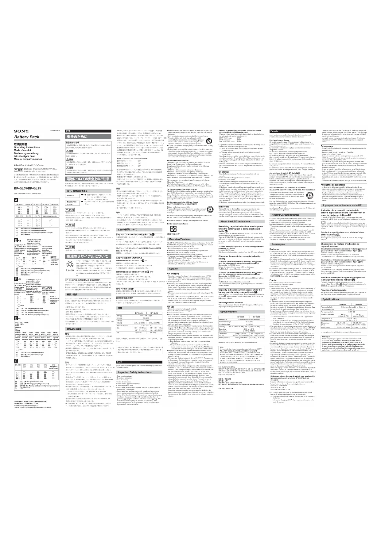 Operating Instructions Mode d’emploi Bedienungsanleitung Istruzioni per l’uso Manual de instrucciones お買い上げいただきありがとうございます。電気製品は、安全のための注意事項を守らないと、人身事故になることがあります。この取扱説明書には、事故を防ぐための重要な注意事項と製品の取り扱いかたを示してあります。この取扱説明書をよくお読みのうえ、製品を安全にお使いください。お読みになったあとは、いつでも見られるところに必ず保管してください。 BP-GL65/BP-GL95 Sony Corporation 2004 Printed in JapanFrançaisAvant la mise en service de cet appareil, lire attentivement ce moded’emploi et le conserver pour toute référence ultérieure.Pour les clients en EuropeCe produit portant la marque CE est conforme à la Directive sur lacompatibilité électromagnétique (EMC) émise par la Commission de laCommunauté européenne.La conformité à cette directive implique la conformité aux normeseuropéennes suivantes :•EN55103-1 : Interférences électromagnétiques (émission)• EN55103-2 : Sensibilité électromagnétique (immunité)Ce produit est prévu pour être utilisé dans les environnementsélectromagnétiques suivants : E1 (résidentiel), E2 (commercial et industrielégère), E3 (urbain extérieur) et E4 (environnement EMC contrôlé, ex.studio de télévision).Le fabricant de ce produit est Sony Corporation, 1-7-1 Konan, Minato-ku,Tokyo, Japon.Le représentant autorisé pour EMC et la sécurité des produits est SonyDeutschland GmbH, Hedelfinger Strasse 61, 70327 Stuttgart, Allemagne.Aux acheteurs de batterie BP-GL65/GL95La batterie BP-GL65/GL95 au lithium ionisé dispose d’une capaciténominale inférieure à 100 Wh. Elle peut donc être transportée en tant quebatterie au lithium ionisé non dangereuse. Cependant, les lois etrèglements sont soumis aux changements. Pour en savoir plus sur lesconditions de transport des batteries, veuillez consulter votre compagnieaérienne de transport.Pour les utilisateurs aux Etats-Unis et au Canada.RECYCLAGE DES ACCUMULATEURS AUX IONS DE LITHIUMLes accumulateurs aux ions de lithium sont recyclables.Vous pouvez contribuer à préserver l’environnement enrapportant les piles usées dans un point de collection etrecyclage le plus proche.Pour plus d’informations sur le recyclage des accumulateurs, téléphonezau numéro gratuit 1-800-822-8837 (Etats-Unis et Canada uniquement), ouvisitez http://www.rbrc.org/Avertissment: Ne pas utiliser des accumulateurs aux ions de lithium quisont endommagés ou qui fuient. Aperçu/Caractéristiques La batterie rechargeable BP-GL65/GL95 est au lithium-ion. Utilisez labatterie BP-GL65/GL95 seulement avec les appareils dont le moded’emploi /notice d’utilisation recommande son utilisation.Les caractéristiques de la batterie BP-GL65/GL95 sont comme suit:• Vous pouvez recharger la batterie même si elle n’est pas complètementépuisée.• Batterie de petite dimension et de poids léger mais de grande capacité.• La capacité restante est indiquée précisément par l’état de la DEL.• Combinée au chargeur de batterie BC-M150, la BP-GL65/GL95 assistela “fonction INFO” qui tire diverses informations des batteries.• La fonction d’autodiagnostic est disponible et la détection d’uneanomalie est indiquée par segments de DEL clignotants. Remarques Recharge• Vous pouvez recharger la batterie dans une plage de température entre 0°C et 40°C (32°F et 104°F). Cependant, il est conseillé de recharger la batterie entre 10°C et 30°C (50°F et 86°F) pour obtenir de meilleures performances.• La batterie se décharge naturellement au fil de temps. Afin de prolongerla durée de vie du produit, il est recommandé de charger complètementla batterie avant son utilisation. Pour plus de détails sur la recharge,consultez le mode d’emploi/notice d’utilisation fourni avec le chargeurde la batterie.• Il est normal que la batterie chauffe quand elle est utilisée ou rechargée.• La batterie BP-GL65/GL95 peut se charger avec un chargeur BC-L70/L70CE ou BC-M150. Il faut environ 150 minutes (pour la BP-GL65)/145 minutes (pour la BP-GL95) pour la charge complète (quand le BC-L70/L70CE/M150 est utilisé pour la charge).Emploi• Ne court-circuitez jamais les bornes de la batterie.• N’essayez jamais d’ouvrir la batterie.• Evitez les chocs mécaniques.• Veuillez vous adresser au magasin où vous avez acheté cette batterie, ouà votre revendeur habituel avant d’utiliser la batterie avec un produitdont le mode d'emploi/notice d’utilisation n’indique pas de manièreexplicite que cette batterie peut être utilisée, ou lorsque vous voulezutiliser la batterie avec une autre source d’alimentation. Une utilisationinadéquate de la batterie peut causer un mauvais fonctionnement del’appareil.• L’impédance interne de la batterie augmente lorsque la températurebaisse à 5°C (41°F) ou en dessous. Cela peut réduire l’autonomie de labatterie ou empêcher la mise sous tension du composant auquel labatterie est raccordée. Ce phénomène est plus fréquent dans le cas d’unebatterie chargée de nombreuses fois que d’une batterie neuve.• Les performances et l’autonomie de la batterie peuvent baisser dans unenvironnement froid. Dans ce cas, procédez comme suit pour augmenterl’autonomie de la batterie:— Conservez la batterie au chaud et installez-la dans l’appareil justeavant l’utilisation.— Ne chargez la batterie qu’avec le chargeur pour batterie au lithium-ion comme le chargeur de batterie BC-L70/L70CE/M150 dans unefourchette de température entre 10ºC et 30ºC (50ºF et 86ºF).