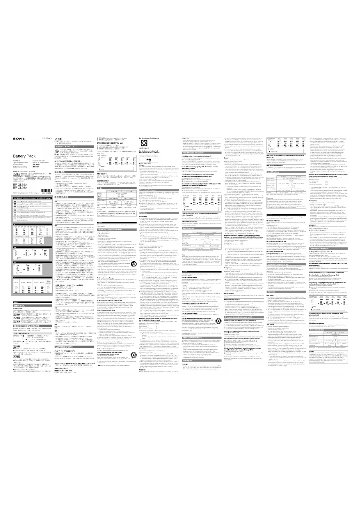 inches) Mass (Approx.) 565 g (1 lb 3.9 oz) 765 g (1 lb 11 oz) Design and specifications are subject to change without notice. Note Always verify that the unit is operating properly before use. SONY WILL NOT BE LIABLE FOR DAMAGES OF ANY KIND INCLUDING, BUT NOT LIMITED TO, COMPENSATION OR REIMBURSEMENT ON ACCOUNT OF THE LOSS OF PRESENT OR PROSPECTIVE PROFITS DUE TO FAILURE OF THIS UNIT, EITHER DURING THE WARRANTY PERIOD OR AFTER EXPIRATION OF THE WARRANTY, OR FOR ANY OTHER REASON WHATSOEVER.FrançaisAvant d’utiliser l’appareil, veuillez lire attentivement ce manuel et le conserver pour future référence.Pour les clients en EuropeCe produit portant la marque CE est conforme à la Directive sur la compatibilité électromagnétique (EMC) émise par la Commission de la Communauté européenne.La conformité à cette directive implique la conformité aux normes européennes suivantes : EN55103-1 : Interférences électromagnétiques (émission) • EN55103-2 : Sensibilité électromagnétique (immunité) • Ce produit est prévu pour être utilisé dans les environnements électromagnétiques suivants : E1 (résidentiel), E2 (commercial et industrie légère), E3 (urbain extérieur) et E4 (environnement EMC contrôlé, ex. studio de télévision).Le fabricant de ce produit est Sony Corporation, 1-7-1 Konan, Minato-ku, Tokyo, 108-0075 Japon.Le représentant autorisé pour EMC et la sécurité des produits est Sony Deutschland GmbH, Hedelfinger Strasse 61, 70327 Stuttgart, Allemagne.Aux acheteurs de batterie BP-GL65A/GL95ALa batterie BP-GL65A/GL95A au lithium ionisé dispose d’une capacité nominale inférieure à 100 Wh. Elle peut donc être transportée en tant que batterie au lithium ionisé non dangereuse. Cependant, les lois et règlements sont soumis aux changements. Pour en savoir plus sur les conditions de transport des batteries, veuillez consulter votre compagnie aérienne de transport.Pour les clients au CanadaCet appareil numérique de la classe B est conforme à la norme NMB-003 du Canada.Pour les utilisateurs aux Etats-Unis et au Canada. RECYCLAGE DES ACCUMULATEURS AUX IONS DE LITHIUM Les accumulateurs aux ions de lithium sont recyclables.Vous pouvez contribuer à préserver l’environnement en rapportant les piles usées dans un point de collection et recyclage le plus proche.Pour plus d’informations sur le recyclage des accumulateurs, téléphonez le numéro gratuit 1-800-822-8837 (Etats-Unis et Canada uniquement), ou visitez http://www.rbrc.org/Avertissement : Ne pas utiliser des accumulateurs aux ions de lithium qui sont endommagées ou qui fuient. Aperçu/Caractéristiques La batterie rechargeable BP-GL65A/GL95A est au lithium-ion. Utilisez la batterie BP-GL65A/GL95A seulement avec les appareils dont le mode d’emploi/notice d’utilisation recommande son utilisation.Les caractéristiques de la batterie BP-GL65A/GL95A sont comme suit : Vous pouvez recharger la batterie même si elle n’est pas complètement • épuisée. Batterie de petite dimension et de poids léger mais de grande capacité • La capacité restante est indiquée précisément par l’état de la DEL. • Combinée au chargeur de batterie BC-L160, la BP-GL65A/GL95A assiste la • “fonction INFO” qui tire diverses informations des batteries. La fonction d’autodiagnostic est disponible et la détection d’une anomalie est • indiquée par segments de DEL clignotants. Remarques Recharge Vous pouvez recharger la batterie dans une plage de température entre 0 °C et • 40 °C (32 °F et 104 °F). Cependant, il est conseillé de recharger la batterie entre 10 °C et 30 °C (50 °F et 86 °F) pour obtenir de meilleures performances. La batterie se décharge naturellement au fil de temps. Afin de prolonger la • durée de vie du produit, il est recommandé de charger complètement la batterie avant son utilisation. Pour plus de détails sur la recharge, consultez le mode d’emploi/notice d’utilisation fourni avec le chargeur de la batterie. Si vous tentez de recharger une batterie entièrement chargée, cela risque de • diminuer sa durée de vie. Assurez-vous de vérifier la capacité restante avant la recharge. Il est normal que la batterie chauffe quand elle est utilisée ou rechargée. • La batterie BP-GL65A/GL95A peut se charger avec un chargeur AC-DN10 ou • BC-L160/L70/L70CE/L500. Il faut environ 150 minutes (pour la BP-GL65A)/145 minutes (pour la BP-GL95A) pour la charge complète (quand le BC-L70/L70CE/L160 est utilisé pour la charge). Emploi Ne court-circuitez jamais les bornes de la batterie. • N’essayez jamais d’ouvrir la batterie. • Evitez les chocs mécaniques. • Veuillez vous adresser au magasin où vous avez acheté cette batterie, ou à • votre revendeur habituel avant d’utiliser la batterie avec un produit dont le mode d’emploi/notice d’utilisation n’indique pas de manière explicite que cette batterie peut être utilisée, ou lorsque vous voulez utiliser la batterie avec une autre source d’alimentation. Une utilisation inadéquate de la batterie peut causer un mauvais fonctionnement de l’appareil. L’impédance interne de la batterie augmente lorsque la température baisse • à 5 °C (41 °F) ou en dessous. Cela peut réduire l’autonomie de la batterie ou empêcher la mise sous tension du composant auquel la batterie est raccordée. Ce phénomène est plus fréquent dans le cas d’une batterie chargée de nombreuses fois que d’une batterie neuve. Les performances et l’autonomie de la batterie peuvent baisser dans un • environnement froid. Dans ce cas, procédez comme suit pour augmenter l’autonomie de la batterie :— Conservez la batterie au chaud et installez-la dans l’appareil juste avant l’utilisation.— Ne chargez la batterie qu’avec le chargeur pour batterie au lithium-ion comme le chargeur de batterie BC-L70/L70CE/L160 dans une fourchette de température entre 10 °C et 30 °C (50 °F et 86 °F). Des courants de d