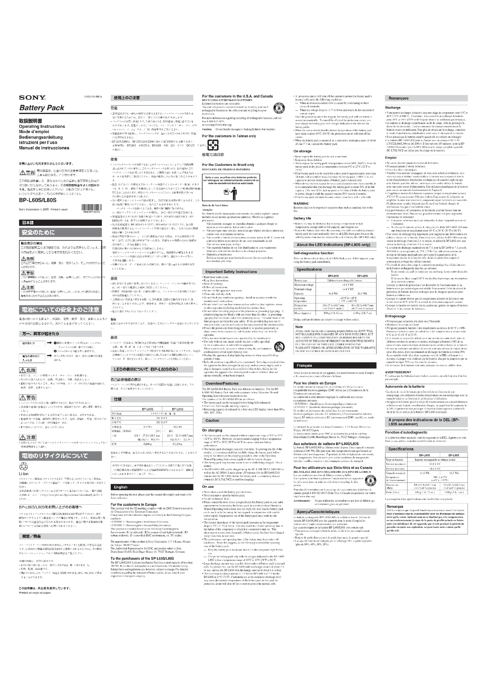 sont endommagées ou qui fuient. Aperçu/Caractéristiques La batterie rechargeable BP-L60S/L80S est au lithium ionisé. Utilisez labatterie BP-L60S/L80S avec les appareils dont le mode d’emploi/lesinstructions d’emploi recommandent son utilisation.Les caractéristiques de la batterie BP-L60S/L80S sont comme suit.• Vous pouvez recharger la batterie même si elle n’est pas complètementépuisée.• Batterie de petite dimension et de poids léger mais de grande capacité.• La capacité restante est indiquée par un affichage DEL à quatre segments(plus de 80%, 60%, 40%, 20%).3-863-919-05(1)煙が出たら電池の液が目に