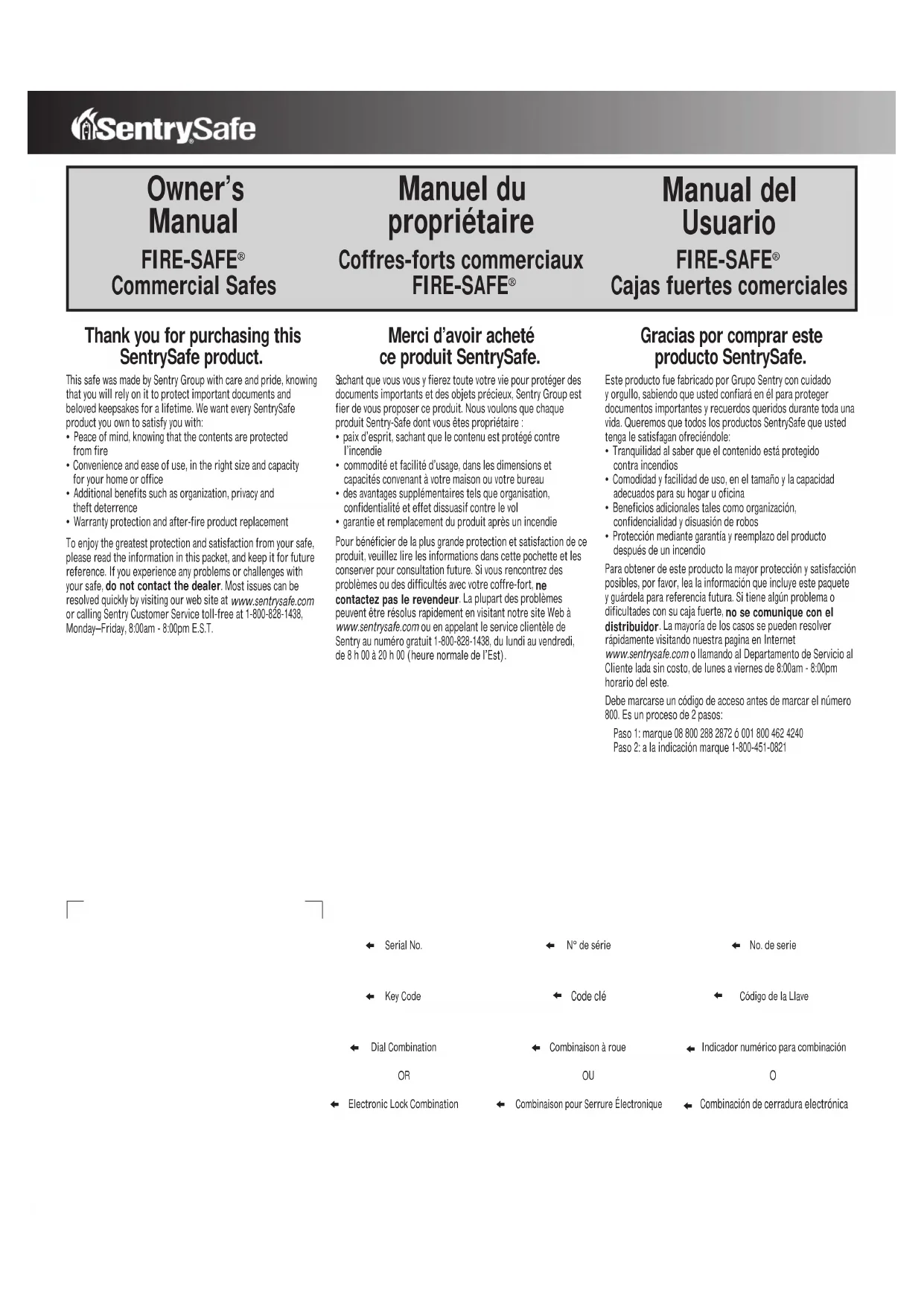 contactez pas le revendeur . La plupart des problèmes peuvent être résolus rapidement en visitant notre site Web à www.sentrysafe.com ou en appelant le service clientèle de Sentry au numéro gratuit 1-800-828-1438, du lundi au vendredi, de 8 h 00 à 20 h 00 (heure normale de l’Est). Gracias por comprar este producto SentrySafe.