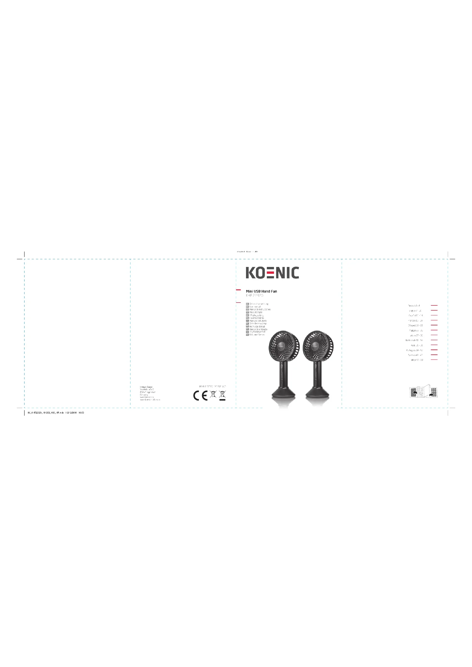 rechargeable de l’appareil sans supervision. IM_KHF22320_191202_V03_HR.indb 16 2/12/2019 10:5317 Français Félicitations! Merci d’avoir acheté un produit KOENIC. Veuillez lire soigneusement ce manuel et le conserver pour une consultation future. Usage prévu Ce produit n’est conçu que pour faire circuler l’air intérieur et extérieur. Toute autre utilisation peut endommager l’appareil ou entraîner des blessures. Cet appareil n’est destiné qu’à l’utilisation domestique et non pas à l’utilisation commerciale. Imtron GmbH n’assume aucune responsabilité quant à des dommages au produit, à des dommages matériels ou à des blessures corporelles dus à une négligence ou un usage inapproprié du produit, ou à un usage du produit non indiqué par le fabricant. Avant de l’utiliser pour la Premiere fois Retirez soigneusement le produit et les accessoires de leur emballage d’origine. Vérifiez que le contenu est complet et qu’il n’est pas endommagé. Si le contenu livré est incomplet ou endommagé, contactez immédiatement votre revendeur. Remarque