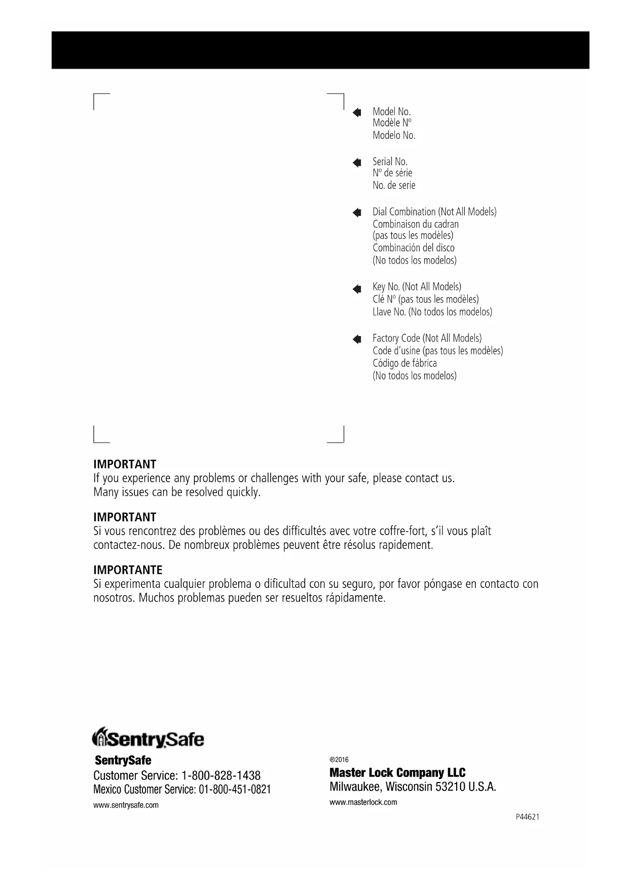 - Español IMPORTANT En cas de problèmes ou de difficultés avec votre coffre-fort, contactez-nous. De nombreux problèmes peuvent être résolus rapidement sans que le produit soit retourné. Notre équipe de service à la clientèle se tient à votre disposition au 1-800-828-1438 pour répondre à vos questions.20 REMARQUE : • Rangez la combinaison et les clés dans un endroit sûr (autre que le coffre-fort). p. 33
