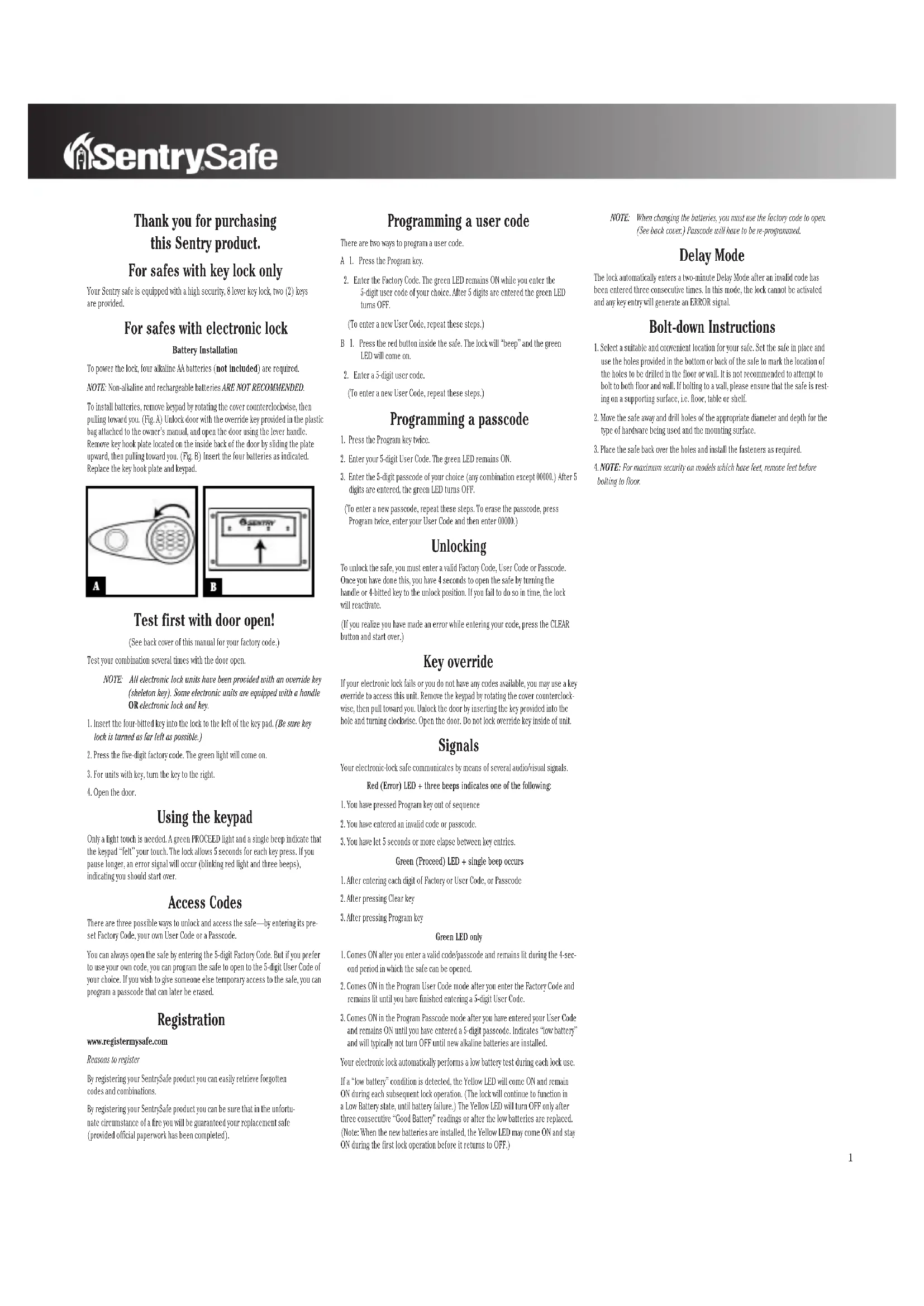 de atornillar al suelo.A B Merci d’avoir acheté ce produit Sentry. Pour coffres-forts munis d’une serrure à clé uniquement Votre coffre Sentry est équipé d’un verrou à clé à 8 leviers de grande sécurité, deux (2) clés sont fournies. Pour coffres-forts munis d’une serrure électronique Pour activer la serrure Pour alimenter la serrure, il faut quatre piles alcalines AA (non fournies). REMARQUE : l’utilisation de piles non alcalines ou rechargeables N’EST PAS RECOMMANDÉE. Pour installer les piles, retirez le clavier en faisant tourner le couvercle dans le sens inverse des aiguilles d’une montre, puis en le tirant vers vous. (figure A) Déverrouillez la porte avec la clé prioritaire (fournie dans le sachet en plastique joint au manuel d’utilisation), puis ouvrez-la à l’aide du bouton de la poignée. Retirez la plaque porte-clés située à l’intérieur, à l’arrière de la porte, en la faisant glisser vers le haut, puis en la tirant vers vous. (figure B) Insérez les quatre piles conformément aux instructions. Remettez en place la plaque porte-clés et le clavier. Essayez d’abord la combinaison avec la porte ouverte ! (Voir le dos de la couverture de ce manuel pour votre Code Usine). Testez plusieurs fois votre combinaison avec la porte ouverte. REMARQUE : toutes les unités à verrou électronique sont livrées avec une clé prioritaire (clé passepartout) Certaines unités électroniques sont équipées d’une poignée OU d’un verrou électronique et d’une clé.