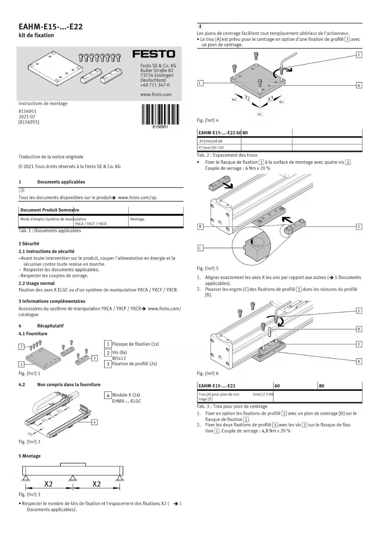 www.festo.com/sp. Document Produit Sommaire Mode d'emploi Système de manipulationYXCA / YXCF / YXCRMontage Tab. 1 : Documents applicables 2 Sécurité