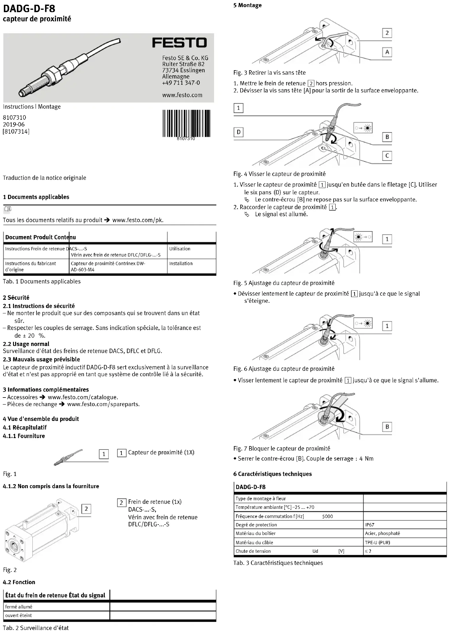 Traduction de la notice originale 1 Documents applicables Tous les documents relatifs au produit èwww.festo.com/pk. Document Produit Contenu Instructions Frein de retenue DACS-...-S Vérin avec frein de retenue DFLC/DFLG-...-S Utilisation Instructions du fabricant d'origine Capteur de proximité Contrinex DW- AD-603-M4 Installation Tab. 1 Documents applicables 2 Sécurité