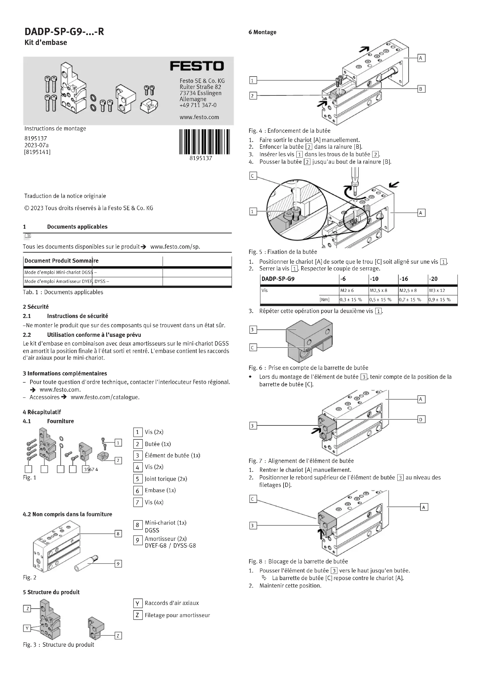 Utilisation conforme à l'usage prévu Le kit d'embase en combinaison avec deux amortisseurs sur le mini-chariot DGSS en amortit la position finale à l'état sorti et rentré. L'embase contient les raccords d'air axiaux pour le mini-chariot. 3 Informations complémentaires