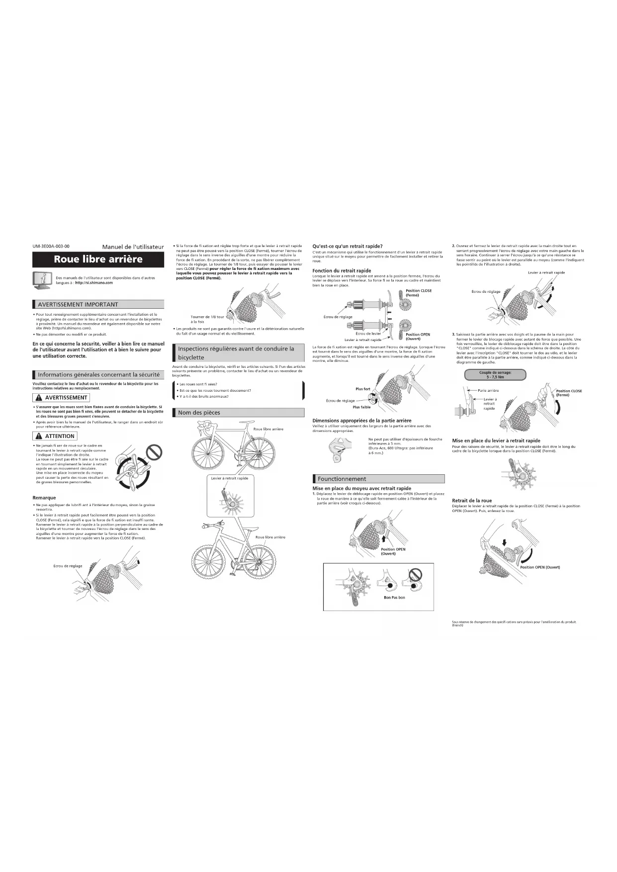 Y a-t-il des bruits anormaux? Nom des pièces Levier à retrait rapideRoue libre arrière Levier à retrait rapide Roue libre arrière Qu'est-ce qu'un retrait rapide? C'est un mécanisme qui utilise le fonctionnement d'un levier à retrait rapide unique situé sur le moyeu pour permettre de facilement installer et retirer la roue. Fonction du retrait rapide Lorsque le levier à retrait rapide est amené à la position fermée, l'écrou du levier se déplace vers l'interieur. Sa force fi xe la roue au cadre et maintient bien la roue en place.Position CLOSE (Fermé)Position OPEN (Ouvert)Écrou de réglageÉcrou de levierLevier à retrait rapideLa force de fi xation est réglée en tournant l'écrou de réglage. Lorsque l'écrou est tourné dans le sens des aiguilles d'une montre, la force de fi xation augmente, et lorsqu'il est tourné dans le sens inverse des aiguilles d'une montre, elle diminue.Écrou de réglagePlus faiblePlus fort Dimensions appropriées de la partie arrière Veillez à utiliser uniquement des largeurs de la partie arrière avec des dimensions appropriées.Ne peut pas utiliser d'épaisseurs de fourche inférieures à 5 mm.(Dura-Ace, 600 Ultegra: pas inférieure à 6 mm.) Founctionnement Mise en place du moyeu avec retrait rapide 1. Déplacez le levier de déblocage rapide en position OPEN (Ouvert) et placez la roue de manière à ce qu'elle soit fermement calée à l'intérieur de la partie arrière (voir croquis ci-dessous).Position OPEN (Ouvert)Bon Pas bon2. Ouvrez et fermez le levier de retrait rapide avec la main droite tout en serrant progressivement l'écrou de réglage avec votre main gauche dans le sens horaire. Continuer à serrer l'écrou jusqu'à ce qu'une résistance se fasse sentir au point où le levier est parallèle au moyeu (comme l'indiquent les pointillés de l'illustration à droite).Écrou de réglageLevier à retrait rapide3. Saisissez la partie arrière avec vos doigts et la paume de la main pour fermer le levier de blocage rapide avec autant de force que possible. Une fois verrouillée, le levier de déblocage rapide doit être dans la position "CLOSE" comme indiqué ci-dessous dans le schéma de droite. Le côté du levier avec l'inscription "CLOSE" doit tourner le dos au vélo, et le levier doit être parallèle à la partie arrière, comme indiqué ci-dessous dans la diagramme de gauche. Couple de serrage: 5 - 7,5 Nm Parie arrièreLevier à retrait rapidePosition CLOSE (Fermé) Mise en place du levier à retrait rapide Pour des raisons de sécurité, le levier à retrait rapide doit être le long du cadre de la bicyclette lorsque dans la position CLOSE (Fermé). Retrait de la roue Déplacer le levier à retrait rapide de la position CLOSE (Fermé) à la position OPEN (Ouvert). Puis, enlevez la roue. Position OPEN (Ouvert)