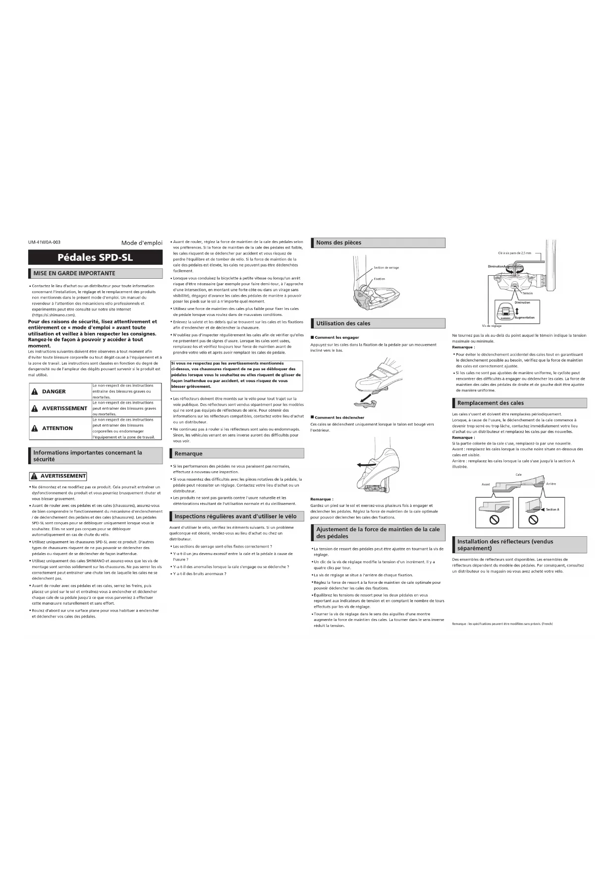 Si les cales ne sont pas ajustées de manière uniforme, le cycliste peut rencontrer des difficultés à engager ou déclencher les cales. La force de maintien des cales des pédales de droite et de gauche doit être ajustée de manière uniforme. Remplacement des cales Les cales s'usent et doivent être remplacées périodiquement.Lorsque, à cause de l'usure, le déclenchement de la cale commence à devenir trop serré ou trop lâche, contactez immédiatement votre lieu d'achat ou un distributeur et remplacez les cales par des nouvelles.Remarque:Si la partie colorée de la cale s'use, remplacez-la par une nouvelle.Avant: remplacez les cales lorsque la couche noire située en-dessous des cales est visible.Arrière: remplacez les cales lorsque la cale s'use jusqu'à la section A illustrée.SectionAAvant Cale Arrière Installation des réflecteurs (vendus séparément) Des ensembles de réflecteurs sont disponibles. Les ensembles de réflecteurs dépendent du modèle des pédales. Par conséquent, consultez un distributeur ou le magasin où vous avez acheté votre vélo. UM-41W0A-003 Mode d'emploi Remarque : les spécifications peuvent être modifiées sans préavis. (French)