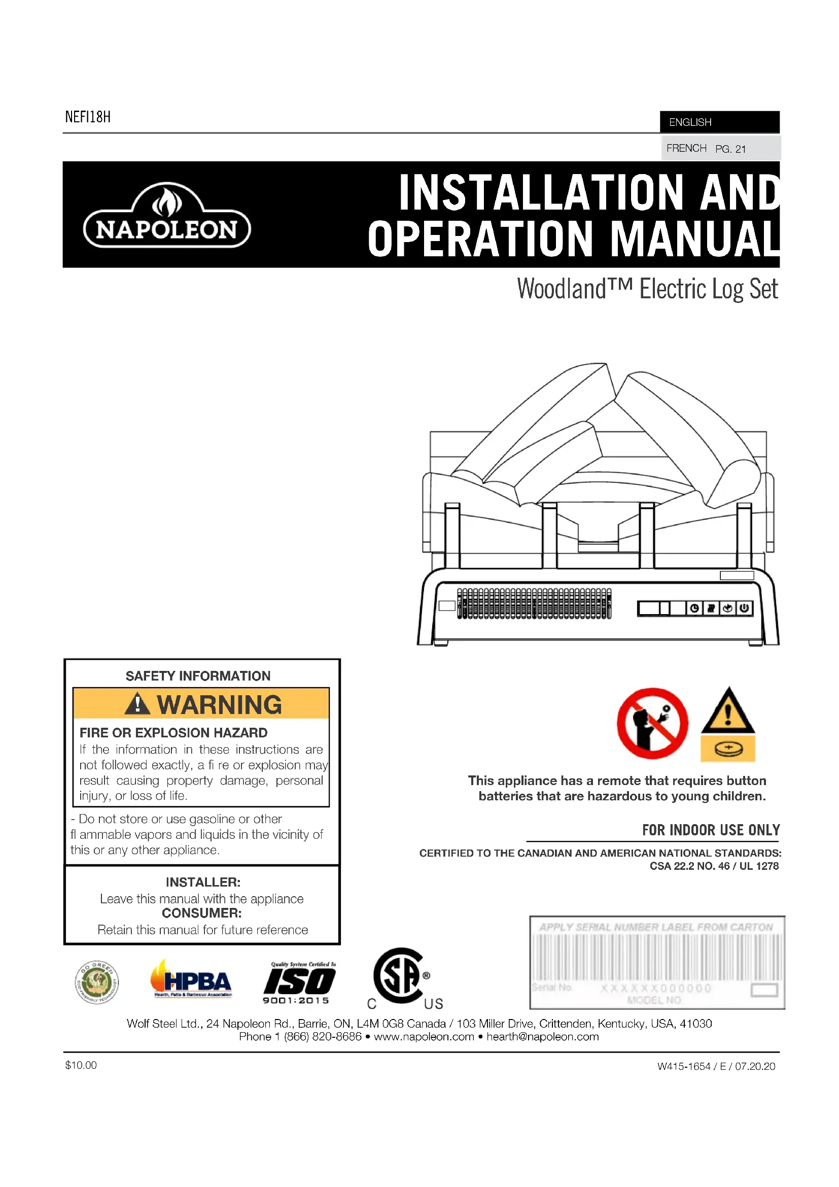 Woodland NEFI18H - Cheminée Napoleon - Notice d'utilisation et mode d'emploi gratuit