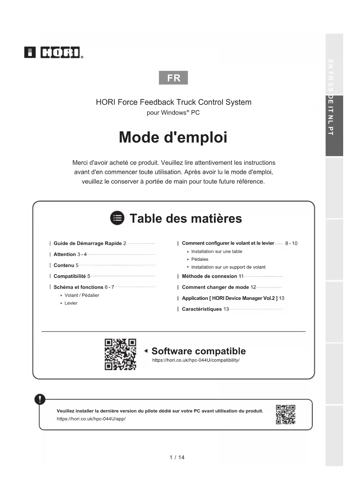 Table des matières Software compatible HORI Force Feedback Truck Control System pour Windows® PCGuide de Démarrage Rapide 2Attention 3 - 4Contenu 5Compatibilité 5Schéma et fonctions 6 - 78 - 10Comment configurer le volant et le levierInstallation sur une tablePédalesInstallation sur un support de volantVolant / PédalierLevierMéthode de connexion 11Comment changer de mode 12Application [ HORI Device Manager Vol.2 ] 13Caractéristiques 131 / 14EN FR ES DE IT NL PThttps://hori.co.uk/hpc-044U/compatibility/https://hori.co.uk/hpc-044U/app/Veuillez installer la dernière version du pilote dédié sur votre PC avant utilisation du produit.Guide de Démarrage Rapide