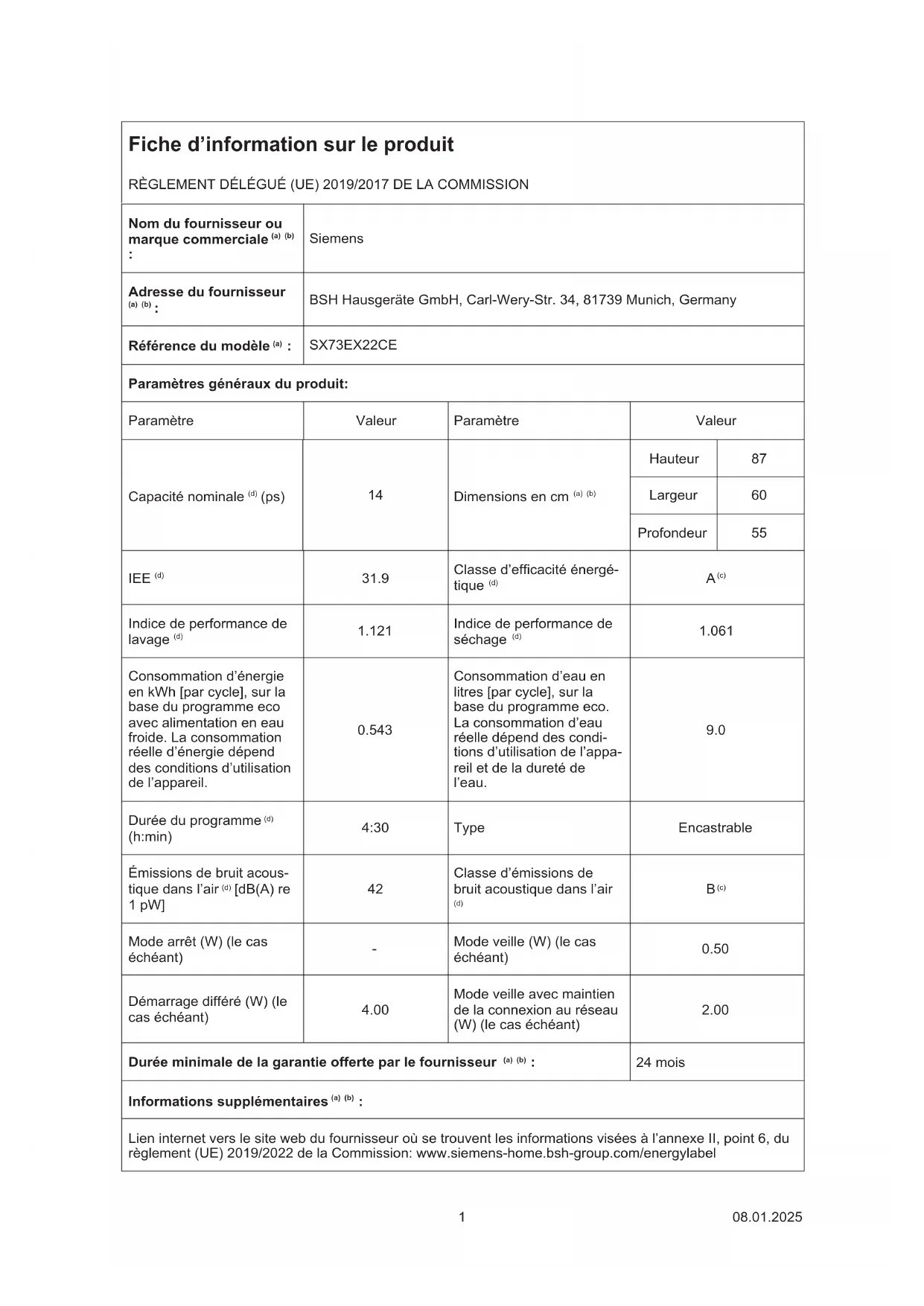Lien internet vers le site web du fournisseur où se trouvent les informations visées à l’annexe II, point 6, du règlement (UE) 2019/2022 de la Commission: www.siemens-home.bsh-group.com/energylabel