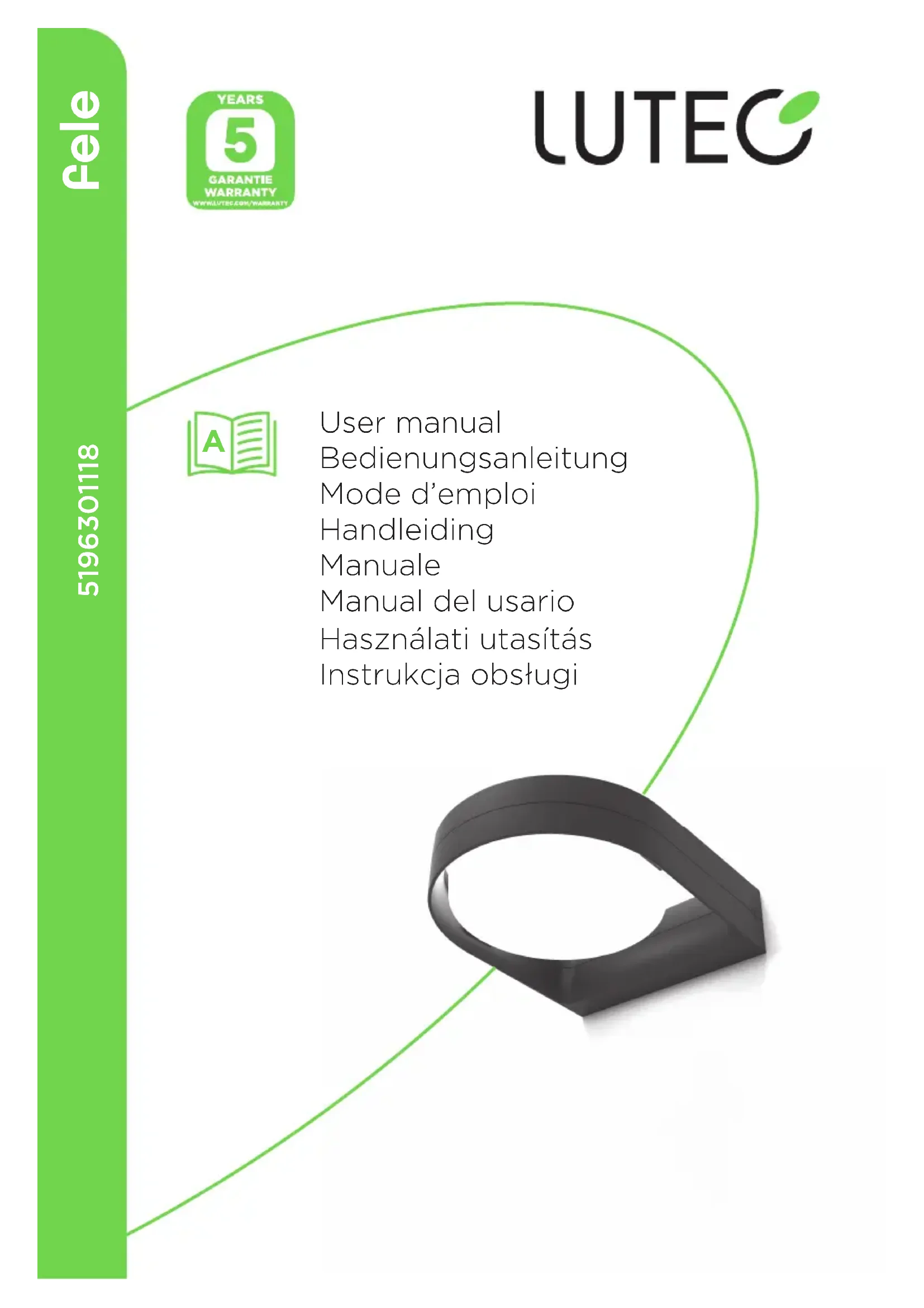 - Les lampes sont montées et installées conformément aux instructions d'installation de LUTEC ; • Les ampoules remplaçables sont conformes aux normes applicables à ces ampoules remplaçables et sont spécifiquement approuvées pour l'utilisation prévue (plaque signalétique, instructions d'installation/montage) ;• Les surfaces du produit ne présentent pas de signes de dommages chimiques ou physiques causés par une manipulation inappropriée (par ex. les surfaces du produit ne présentent pas de signes de dommages chimiques ou physiques causés par une manipulation incorrecte (par exemple, l'utilisation de produits de nettoyage inappropriés ou d'objets tranchants). En cas de garantie, veuillez contacter votre revendeur local auprès duquel vous avez acheté le produit ou directement LUTEC Europe. Les coordonnées des partenaires locaux de LUTEC sont disponibles sur www.lutec.com. Le concessionnaire/vendeur et/ou LUTEC Europe doivent être informés rapidement de tout défaut/défaut dans les 30 jours suivant la découverte du défaut, sinon nous ne reconnaîtrons pas la réclamation. Pour faire une réclamation au titre de la garantie, soumettez la preuve d'achat, y compris la date d'achat et le numéro de modèle du produit. Les droits de garantie légaux ne sont pas aectés par cette garantie et s'appliquent en plus de celle-ci. Il en va de même pour les réclamations contre le vendeur. Adresse complète du garant : LUTEC Europe NV Herentalsebaan 425 B-2160 Wommelgem - BelgiqueTéléphone : : +32 (0)3 284 51 62Email : info@lutec-europe.com info@lutec.comwww.lutec.com www.lutec.com/warranty La source lumineuse peut uniquement être remplacée par un spécialiste. REMPLAÇABLE (LED SEULEMENT)SOURCE DE LUMIÈRE PAR PROFESSIONNEL IP54 Type d’ampoule: Instructions de sécurité Tension d’alimentation: 220-240 V~, 50/60 Hz LED (13.5W) Conforme à toutes les exigences de la directive CE. Étanche aux éclaboussures Les produits électriques usagés ne doivent pas être jetés avec les ordures ménagères. Veuillez les recycler là où des installations existent. Vérifiez auprès de votre autorité locale ou de votre magasin local pour obtenir des conseils sur le recyclage. Produit de classe I, doit être relié à la terre. Données techniques Tous les produits LUTEC répondent aux exigences de qualité les plus élevées et ont été soumis à un contrôle de qualité strict. Les produits sont conçus, produits et testés conformément aux normes de sécurité internationales et européennes. LUTEC Europe NV, Herentalsebaan 425, B-2160 Wommelgem - Belgique ("LUTEC Europe") accordera une garantie opérationnelle selon les termes et conditions suivants : Conditions de Garantie