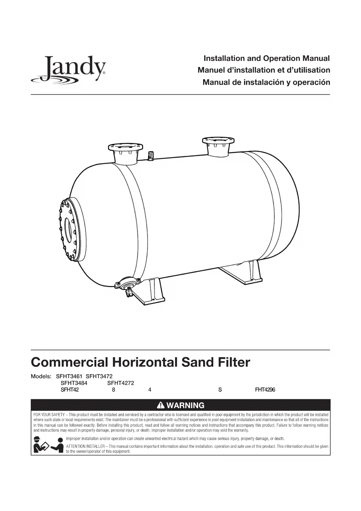 est une marque déposée de Zodiac International, S.A.S.U, utilisée sous licence. Toutes les autres marques sont la propriété de leurs propriétaires respectifs. H0805300_REVBInstallation and Operation Manual Manuel d’installation et d’utilisation Manual de instalación y operación Filtro de arena horizontal comercial Modelos: SFHT3461 SFHT3472 SFHT3484 SFHT4272
