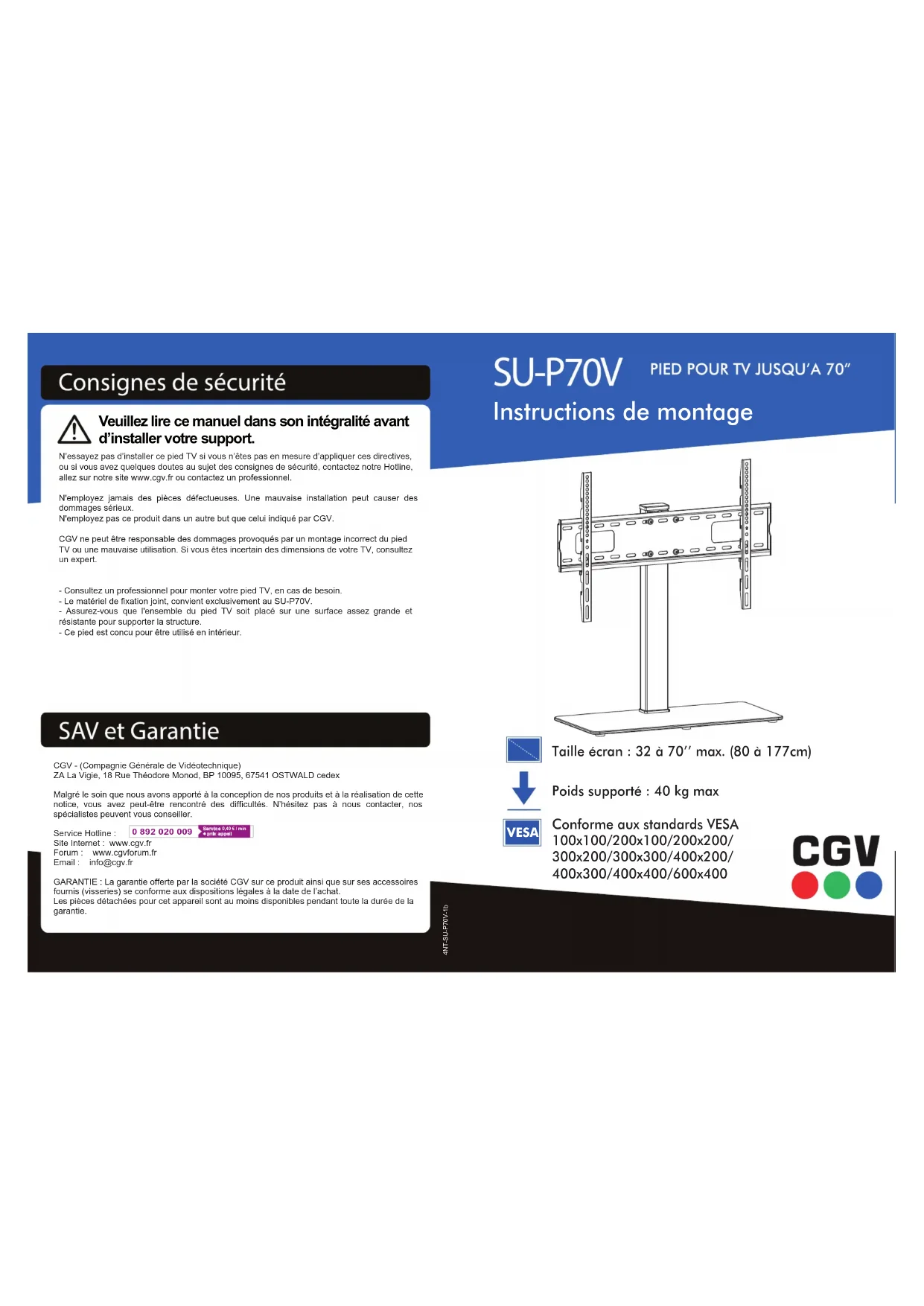 VESA Conforme aux standards VESA 100x100/200x100/200x200/ 300x200/300x300/400x200/ 400x300/400x400/600x400 Poids supporté : 40 kg max Taille écran : 32 à 70’’ max. (80 à 177cm) Instructions de montage 4NT-SU-P70V-1b N’essayez pas d’installer ce pied TV si vous n’êtes pas en mesure d’appliquer ces directives, ou si vous avez quelques doutes au sujet des consignes de sécurité, contactez notre Hotline, allez sur notre site www.cgv.fr ou contactez un professionnel. N'employez jamais des pièces défectueuses. Une mauvaise installation peut causer des dommages sérieux. N'employez pas ce produit dans un autre but que celui indiqué par CGV. CGV ne peut être responsable des dommages provoqués par un montage incorrect du pied TV ou une mauvaise utilisation. Si vous êtes incertain des dimensions de votre TV, consultez un expert. - Consultez un professionnel pour monter votre pied TV, en cas de besoin. - Le matériel de fixation joint, convient exclusivement au SU-P70V. - Assurez-vous que l'ensemble du pied TV soit placé sur une surface assez grande et résistante pour supporter la structure. - Ce pied est concu pour être utilisé en intérieur. Veuillez lire ce manuel dans son intégralité avant d’installer votre support. CGV - (Compagnie Générale de Vidéotechnique) ZA La Vigie, 18 Rue Théodore Monod, BP 10095, 67541 OSTWALD cedex Malgré le soin que nous avons apporté à la conception de nos produits et à la réalisation de cette notice, vous avez peut-être rencontré des difficultés. N’hésitez pas à nous contacter, nos spécialistes peuvent vous conseiller. Service Hotline : Site Internet : www.cgv.fr Forum : www.cgvforum.fr Email : info@cgv.fr GARANTIE : La garantie offerte par la société CGV sur ce produit ainsi que sur ses accessoires fournis (visseries) se conforme aux dispositions légales à la date de l’achat. Les pièces détachées pour cet appareil sont au moins disponibles pendant toute la durée de la garantie. 0 892 020 009Servic e+ prix appel0,40 € / min Instructions de montageLore