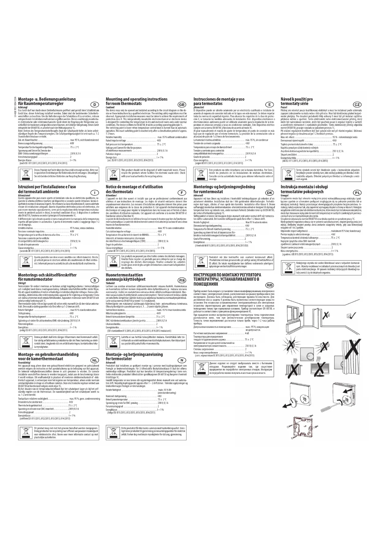 Attention ! L’appareil ne doit être ouvert et installé que par un professionnel conformément aux schémas et aux instructions de montage. Les règles de sécurité existantes doivent être crupuleusement observées. Les mesures d’installation adéquates doivent être prises pour satisfaire aux exigences de la classe de protection II. Cet appareil électromécanique ou électronique est conçu pour réguler la température dans les locaux secs et fermés et dans des conditions d’utilisation normales. Cet appareil est conforme à la norme EN 60730 et fonctionne selon la Directive 1C. Le point de déclenchement est inférieur lorsqu’on tourne le bouton que lors du fonctionne- ment automatique. Le point de déclenchement correct n’est attoint qu’au bout d’une à deux heures de fonctionnement. Humidité relative .................................. max. 95 % sans condensation Calculation impulse voltage ......................... 4 KV Température d’essai du test de dureté de BRINELL ....... 75 ± 2 °C Intensité et tension nécessaires à la mesure des interférences électromagnétiques (CEM) ........... 230 V; 0,1 A Degré de pollution