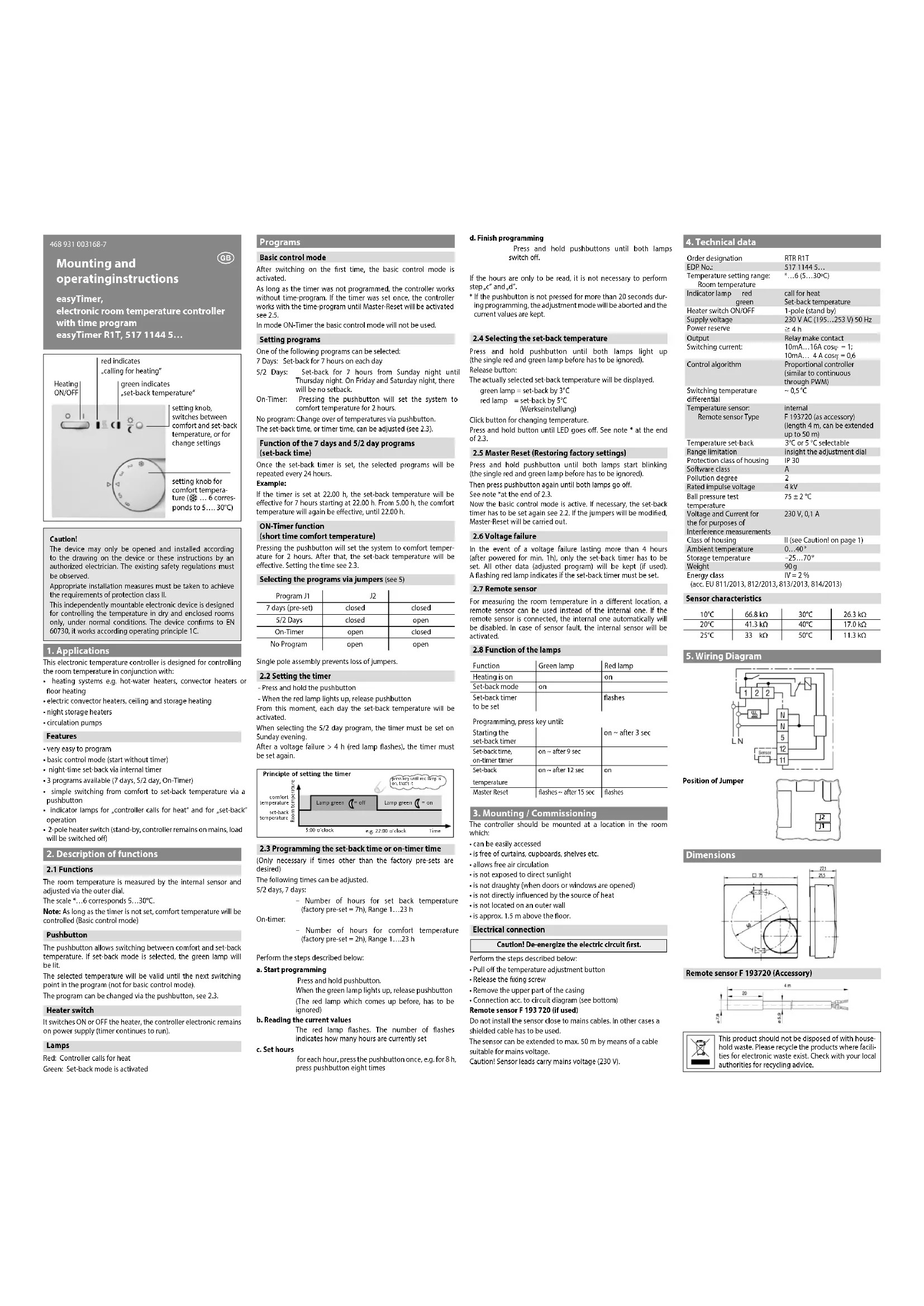 Instructions de montage et de service Thermostats d’ambiance avec programme horloge easyTimer R1T, 517 1144 5… Ces produits ne peuvent pas être traités comme des déchets ménagers. Veuillez faire recycler ces produits par une entreprise qui se charge du recyclage des déchets électroniques. Veuillez contacter les autorités locales pour avoir de plus amples informations concernant la liquidation des déchets.