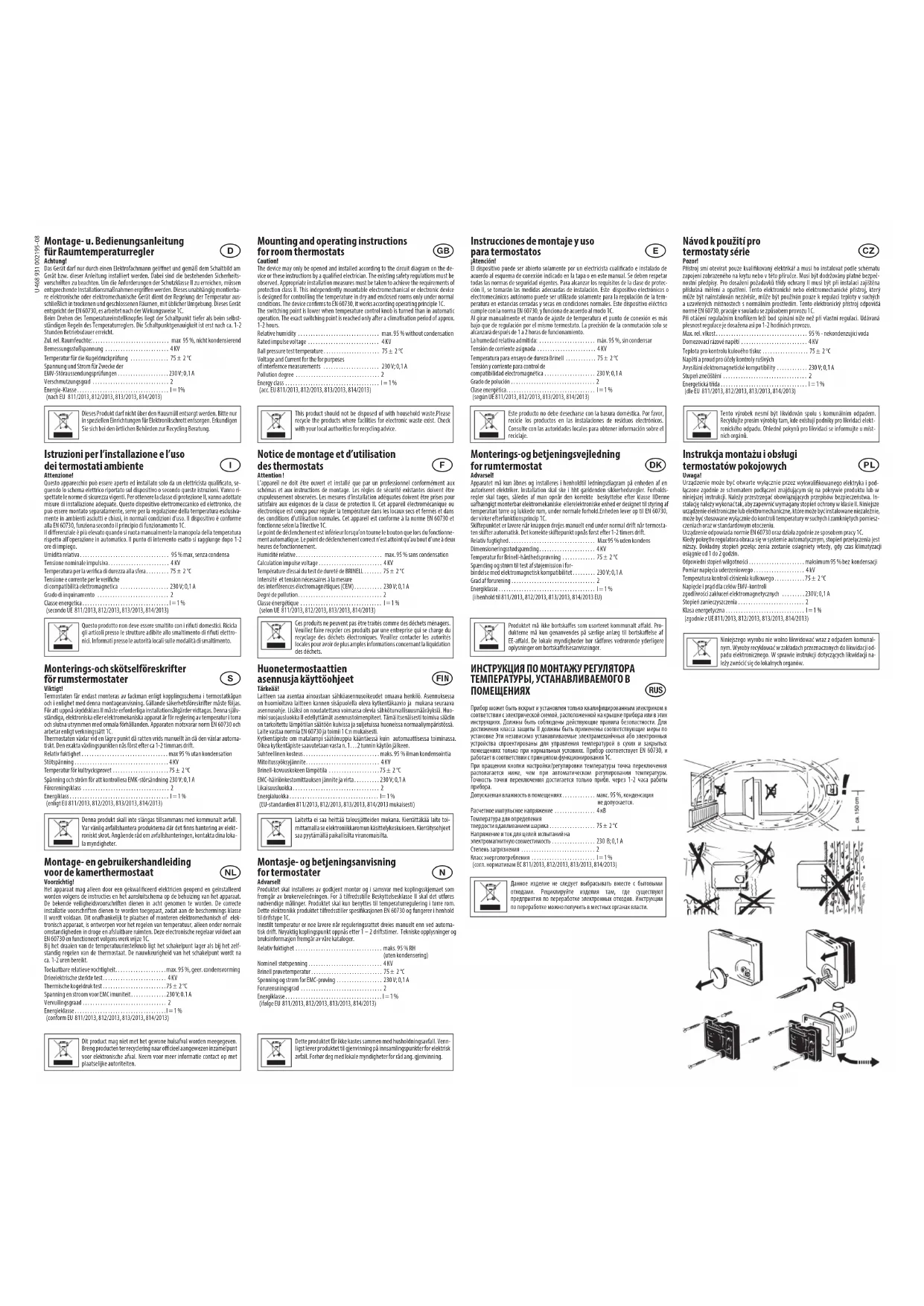 Attention ! L’appareil ne doit être ouvert et installé que par un professionnel conformément aux schémas et aux instructions de montage. Les règles de sécurité existantes doivent être crupuleusement observées. Les mesures d’installation adéquates doivent être prises pour satisfaire aux exigences de la classe de protection II. Cet appareil électromécanique ou électronique est conçu pour réguler la température dans les locaux secs et fermés et dans des conditions d’utilisation normales. Cet appareil est conforme à la norme EN 60730 et fonctionne selon la Directive 1C. Le point de déclenchement est inférieur lorsqu’on tourne le bouton que lors du fonctionne- ment automatique. Le point de déclenchement correct n’est attoint qu’au bout d’une à deux heures de fonctionnement. Humidité relative .................................. max. 95 % sans condensation Calculation impulse voltage ......................... 4 KV Température d’essai du test de dureté de BRINELL ....... 75 ± 2 °C Intensité et tension nécessaires à la mesure des interférences électromagnétiques (CEM) ........... 230 V; 0,1 A Degré de pollution ................................. 2 Classe énergétique ................................ I = 1 % (selon UE 811/2013, 812/2013, 813/2013, 814/2013) Monterings-och skötselföreskrifter för rumstermostater
