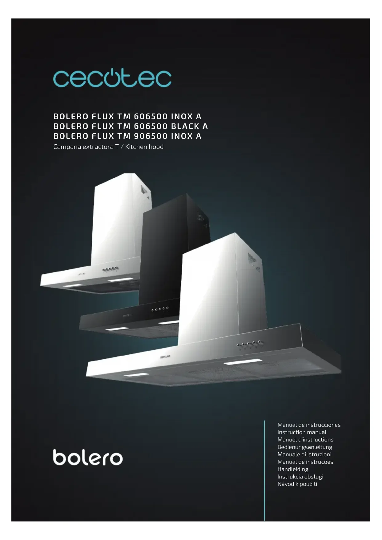 utilisation, car les graisses ou les huiles surchauées peuvent s’enammer. - L’accumulation de graisse dans la hotte peut entraîner un risque d’incendie. Nettoyez l’appareil en suivant les instructions de ce manuel. - Soyez extrêmement prudent lorsque vous nettoyez l’appareil. Risque de brûlures et/ou de coupures. Il est recommandé d’utiliser des gants. - Ne laissez jamais de ammes nues sous la hotte. - Si la hotte aspirante est endommagée, n’essayez pas de l’utiliser. - Lorsque la hotte aspirante et d’autres appareils non électriques fonctionnent simultanément, la pression négative dans l’environnement ne doit pas dépasser 4 Pa (4 x 10-5 bar). - Important! Coupez toujours l’alimentation électrique lors de l’installation et de l’entretien. - La hotte aspirante doit être installée conformément aux instructions d’installation et en respectant toutes les mesures. - Tous les travaux d’installation doivent être eectués par une personne compétente ou un électricien qualié.BOLERO FLUX TM 606500 INOX A / BLACK A / 906500 INOX A14 - Jetez les matériaux d’emballage conformément à la réglementation en vigueur. Tenez les enfants à l’écart de l’emballage. - Faites attention aux bords pointus à l’intérieur de la hotte, en particulier lors de l’installation et du nettoyage. - Assurez-vous que le conduit ne présente pas de courbes supérieures à 90 degrés, car cela réduirait l’ecacité de la hotte. - Avertissement. Si les vis ou les dispositifs de xation ne sont pas installés conformément à ces instructions, cela peut entraîner des risques électriques. - Avertissement. Avant d’accéder aux bornes électriques, tous les circuits d’alimentation doivent être déconnectés. - La pièce doit être susamment ventilée lorsque la hotte aspirante est utilisée en même temps que des appareils à gaz ou d’autres combustibles. - Avertissement L’appareil et ses pièces accessibles peuvent devenir chaudes pendant l’utilisation. Veillez à ne pas toucher les parties accessibles. Les enfants de moins de 8 ans doivent rester éloignés de l’appareil et être surveillés à tout moment. - Les normes relatives à l’évacuation d’air doivent être respectées. - Pour des raisons de sécurité, n’utilisez que les vis de xation ou de montage fournies (le cas échéant, selon le modèle) ou des vis de même taille que celles recommandées dans ce manuel d’instructions. - N’utilisez pas un nettoyeur à vapeur. - N’essayez jamais d’éteindre un feu avec de l’eau, éteignez l’appareil et couvrez la amme, par exemple avec unBOLERO FLUX TM 606500 INOX A / BLACK A / 906500 INOX A 15 couvercle ou une couverture anti-feu. - N’utilisez jamais de câbles de rallonge, de prises multiples ou d’éléments externes de connexion à une minuterie. - Si le câble d’alimentation est endommagé, il doit être substitué par le Service d’Assistance Technique de Cecotec ou par du personnel qualié pour éviter des dangers. - L’appareil ne doit pas être utilisé si le câble d’alimentation est endommagé, abîmé, endommagé ou coupé. - Si l’appareil cesse de fonctionner ou fonctionne anormalement, débranchez-le et contactez le Service d’Assistance Technique de Cecotec. - Cecotec décline toute responsabilité en cas de dommages ou de blessures causés par le non-respect des instructions d›installation et/ou d›utilisation contenues dans ce manuel d›instructions. SICHERHEITSHINWEISE Lesen Sie die folgenden Hinweise aufmerksam durch, bevor Sie das Produkt verwenden. Bewahren Sie diese Bedienungsanleitung zum Nachschlagen oder für neue Benutzer auf. - Dieses Gerät kann von Kindern ab 8 Jahren und darüber sowie von Personen mit verringerten physischen, sensorischen oder mentalen Fähigkeiten oder Mangel an Erfahrung und Wissen benutzt werden, wenn sie beaufsichtigt oder bezüglich des sicheren Gebrauchs des Geräts unterwiesen wurden und die daraus resultierenden Gefahren verstehen. Kinder dürfen nicht mit dem Gerät spielen. Reinigung und Wartung durch den Benutzer sollten nicht von Kindern ohne Aufsicht durchgeführt werden.BOLERO FLUX TM 606500 INOX A / BLACK A / 906500 INOX A16 - Dieses Gerät ist nur für den Hausgebrauch bestimmt und darf nicht in Bars, Restaurants, Bauernhöfen, Hotels, Motels und Büros verwendet werden. - Wenn das Netzkabel beschädigt ist, muss es durch den Hersteller, den Kundenservice oder qualiziertes Personal ersetzt werden, um Schäden zu vermeiden. - Sie muss es ermöglichen, das Gerät nach der Installation von der Stromversorgung zu trennen. - Wird die Dunstabzugshaube gleichzeitig mit Gas- oder anderen Brennstogeräten verwendet, so ist für eine ausreichende Belüftung des Raumes zu sorgen. - Es besteht Brandgefahr, wenn die Reinigung nicht gemäß den Anweisungen durchgeführt wird. - Flambieren Sie nicht unter der Dunstabzugshaube. - VORSICHT: Zugängliche Teile können bei der Verwendung mit Kochgeräten heiß werden. - Die Luft darf nicht in einen Schornstein eingeleitet werden, der zur Ableitung von Abgasen aus Geräten dient, die Gas oder andere Brennstoe verbrennen. - Der Mindestabstand zwischen der Auageäche der Kochgefäße auf der Arbeitsplatte und dem untersten Teil der Dunstabzugshaube muss mindestens 65 cm betragen, wenn die Dunstabzugshaube über einem Gasgerät angebracht ist. Wenn in der Installationsanleitung des Gaskochfeldes ein größerer Abstand angegeben ist, muss dieser berücksichtigt werden. Der Abstand von 65 cm kann für reduziert werden: