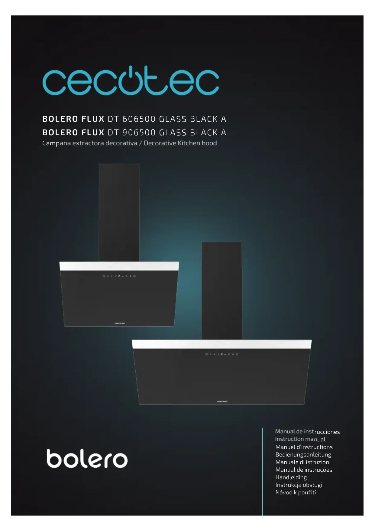 utilisation, car les graisses ou les huiles surchauées peuvent s’enammer. - L’accumulation de graisse dans la hotte peut entraîner un risque d’incendie. Nettoyez l’appareil en suivant les instructions de ce manuel. - Soyez extrêmement prudent lorsque vous nettoyez l’appareil. Risque de brûlures et/ou de coupures. Il est recommandé d’utiliser des gants. - Ne laissez jamais de ammes nues sous la hotte. - Si la hotte aspirante est endommagée, n’essayez pas de l’utiliser. - Lorsque la hotte aspirante et d’autres appareils non15 BOLERO FLUX DT 606500 GLASS BLACK A / BOLERO FLUX DT 906500 GLASS BLACK A électriques fonctionnent simultanément, la pression négative dans l’environnement ne doit pas dépasser 4 Pa (4 x 10-5 bar). - Important! Coupez toujours l’alimentation électrique lors de l’installation et de l’entretien. - La hotte aspirante doit être installée conformément aux instructions d’installation et en respectant toutes les mesures. - Tous les travaux d’installation doivent être eectués par une personne compétente ou un électricien qualié. - Jetez les matériaux d’emballage conformément à la réglementation en vigueur. Tenez les enfants à l’écart de l’emballage. - Faites attention aux bords pointus à l’intérieur de la hotte, en particulier lors de l’installation et du nettoyage. - Assurez-vous que le conduit ne présente pas de courbes supérieures à 90 degrés, car cela réduirait l’ecacité de la hotte. - Avertissement. Si les vis ou les dispositifs de xation ne sont pas installés conformément à ces instructions, cela peut entraîner des risques électriques. - Avertissement. Avant d’accéder aux bornes électriques, tous les circuits d’alimentation doivent être déconnectés. - La pièce doit être susamment ventilée lorsque la hotte aspirante est utilisée en même temps que des appareils à gaz ou d’autres combustibles. - Avertissement L’appareil et ses pièces accessibles peuvent devenir chaudes pendant l’utilisation. Veillez à ne pas toucher les parties accessibles. Les enfants de moins de 8 ans doivent rester éloignés de l’appareil et être surveillés à tout moment. - Les normes relatives à l’évacuation d’air doivent être respectées.16 BOLERO FLUX DT 606500 GLASS BLACK A / BOLERO FLUX DT 906500 GLASS BLACK A - Pour des raisons de sécurité, n’utilisez que les vis de xation ou de montage fournies (le cas échéant, selon le modèle) ou des vis de même taille que celles recommandées dans ce manuel d’instructions. - N’utilisez pas un nettoyeur à vapeur. - N’essayez jamais d’éteindre un feu avec de l’eau, éteignez l’appareil et couvrez la amme, par exemple avec un couvercle ou une couverture anti-feu. - N’utilisez jamais de câbles de rallonge, de prises multiples ou d’éléments externes de connexion à une minuterie. - Si le câble d’alimentation est endommagé, il doit être substitué par le Service d’Assistance Technique de Cecotec ou par du personnel qualié pour éviter des dangers. - L’appareil ne doit pas être utilisé si le câble d’alimentation est endommagé, abîmé, endommagé ou coupé. - Si l’appareil cesse de fonctionner ou fonctionne anormalement, débranchez-le et contactez le Service d’Assistance Technique de Cecotec. - Cecotec décline toute responsabilité en cas de dommages ou de blessures causés par le non-respect des instructions d’installation et/ou d’utilisation contenues dans ce manuel d’instructions.17 BOLERO FLUX DT 606500 GLASS BLACK A / BOLERO FLUX DT 906500 GLASS BLACK A SICHERHEITSHINWEISE Lesen Sie die folgenden Hinweise aufmerksam durch, bevor Sie das Produkt verwenden. Bewahren Sie diese Bedienungsanleitung zum Nachschlagen oder für neue Benutzer auf. - Dieses Gerät kann von Kindern ab 8 Jahren und darüber sowie von Personen mit verringerten physischen, sensorischen oder mentalen Fähigkeiten oder Mangel an Erfahrung und Wissen benutzt werden, wenn sie beaufsichtigt oder bezüglich des sicheren Gebrauchs des Geräts unterwiesen wurden und die daraus resultierenden Gefahren verstehen. Kinder dürfen nicht mit dem Gerät spielen. Reinigung und Wartung durch den Benutzer sollten nicht von Kindern ohne Aufsicht durchgeführt werden. - Dieses Gerät ist nur für den Hausgebrauch bestimmt und darf nicht in Bars, Restaurants, Bauernhöfen, Hotels, Motels und Büros verwendet werden. - Wenn das Netzkabel beschädigt ist, muss es durch den Hersteller, den Kundenservice oder qualiziertes Personal ersetzt werden, um Schäden zu vermeiden. - Sie muss es ermöglichen, das Gerät nach der Installation von der Stromversorgung zu trennen. - Wird die Dunstabzugshaube gleichzeitig mit Gas- oder anderen Brennstogeräten verwendet, so ist für eine ausreichende Belüftung des Raumes zu sorgen. - Es besteht Brandgefahr, wenn die Reinigung nicht gemäß den Anweisungen durchgeführt wird. - Unter der Dunstabzugshaube darf nicht geammt werden. - VORSICHT: Zugängliche Teile können bei der Verwendung mit Kochgeräten heiß werden. - Die Luft darf nicht in einen Schornstein eingeleitet werden, der zur Ableitung von Abgasen aus Geräten dient, die Gas oder andere Brennstoe verbrennen.18 BOLERO FLUX DT 606500 GLASS BLACK A / BOLERO FLUX DT 906500 GLASS BLACK A - Der Mindestabstand zwischen der Auageäche der Kochgefäße auf der Arbeitsplatte und dem untersten Teil der Dunstabzugshaube muss mindestens 65 cm betragen, wenn die Dunstabzugshaube über einem Gasgerät angebracht ist. Wenn in der Installationsanleitung des Gaskochfeldes ein größerer Abstand angegeben ist, muss dieser berücksichtigt werden. Der Abstand von 65 cm kann für reduziert werden:
