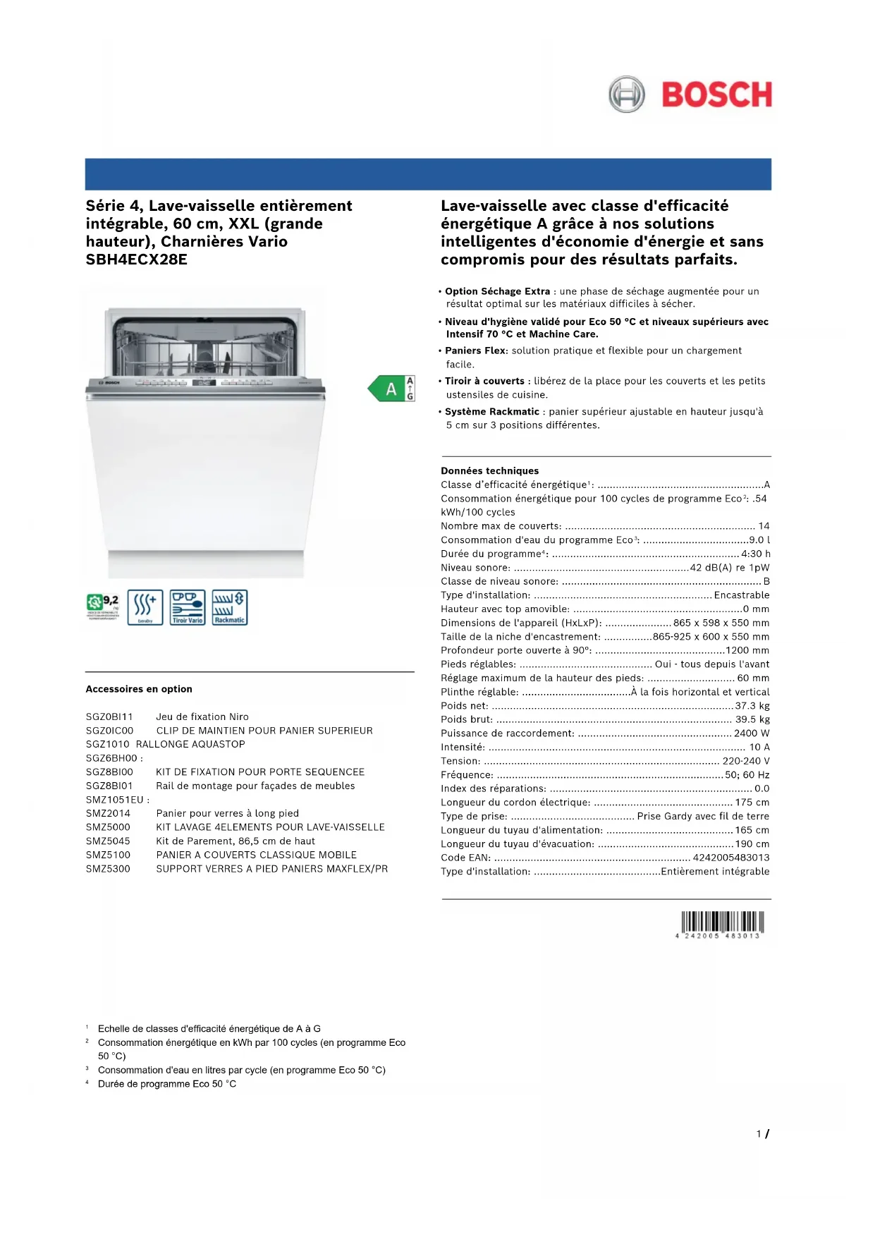 Lave-vaisselle avec classe d'efficacité énergétique A grâce à nos solutions intelligentes d'économie d'énergie et sans compromis pour des résultats parfaits. Performance et consommation - Classe d'efficacité énergétique¹: A - Consommation Energie² / Eau³: 54 kWh / 9 litres - Capacité: 14 couverts - Durée progr. Eco⁴ : 4:30 (h:min) - Niveau sonore:42 dB(A) re 1 pW - Niveau sonore progr. Silence : 41 dB(A) re 1 pW - Classe d'efficacité sonore : B - EcoSilence Drive Programmes/Options - 6 programmes: Eco 50 °C, Auto 45-65 °C, Intensif 70 °C, Court 60 °C, Silence 50 °C, Prélavage - 4 options : Home Connect par WLAN (contrôle du lave-vaisselle à distance), Extra sec, Demi-charge, SpeedPerfect+ - Machine Care - Programme Favourite - Home Connect par WLAN - Fonctions complémentaires via l'application Home Connect: HygienePlus, Silence on demand Caractéristiques techniques - EfficientDry et échangeur thermique - Revêtement intérieur: Acier inox - AquaSensor - Assistant de dosage - Signal acoustique de fin de programme - Démarrage différé électronique: 1-24 heures - Détection automatique du type de produit de lavage - aquaStop® : garantie Bosch en cas de dégât des eaux - pour toute la durée de vie de l'appareil* - Glass protection technology - Filtre autonettoyant, à triple filtre - Protection anti vapeur, protège le plan de travail - Entonnoir pour verser le sel régénérant dans le lave-vaisselle Confort/Sécurité - Paniers Flex - Tiroir à couverts Vario - 3ème niveau - Panier supérieur réglable en hauteur avec RackMatic (à 3 niveaux) - Low Friction Wheels sur le panier inférieur - Supports pour tasses dans le panier supérieur (2x) - Range-assiettes rabattables dans le panier supérieur (2x) - Range-assiettes rabattables dans le panier inférieur (2x) - Supports pour tasses dans le panier inférieur (2x) - Rack Stopper pour éviter le déraillement du panier inférieur Commande et affichage - Commande sur le bord supérieur de la porte - Affichage en texte clair (Anglais) - StatusLight - Affichage du temps résiduel en minutes Accessoires inclus - Dimensions (H x L x P): 86.5 x 59.8 x 55 cm - Charnières Vario ¹ Echelle de classes d'efficacité énergétique de A à G ² Consommation énergétique en kWh par 100 cycles (en programme Eco 50 °C) ³ Consommation d'eau en litres par cycle (en programme Eco 50 °C) ⁴ Durée du programme Eco 50 °C
