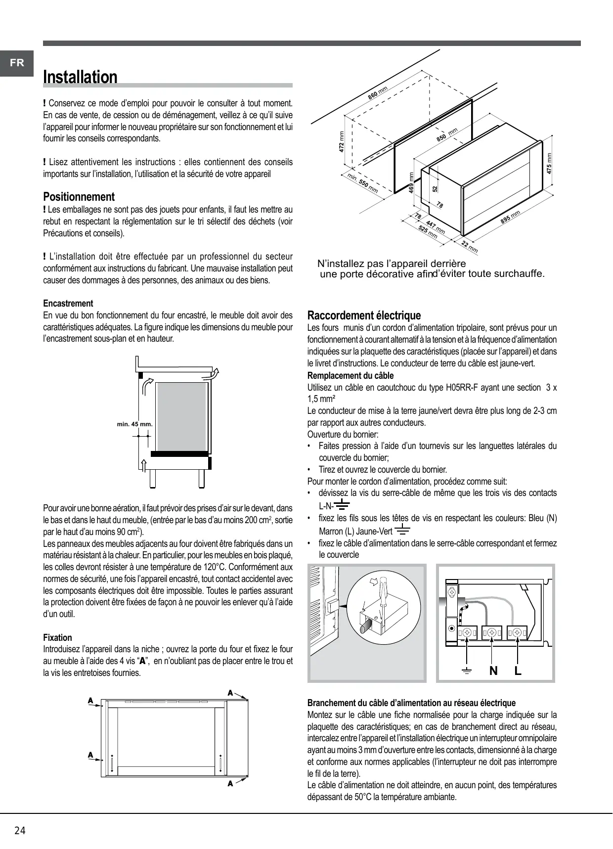 Les panneaux des meubles adjacent au four doivent être fabriqués dans un matériel résistant à la chaleur. En particulier, pour les meubles en bois plaqué, les colles devront résister à une température de 120^ . Conformément aux normes de sécurité, une fois l'appareil encastré, tout contact accidentel avec les composants électriques doit être impossible. Toutes le parties assurant la protection doivent être fixées de façon à ne pouvoir les enlever qu'à l'aide d'un outil.