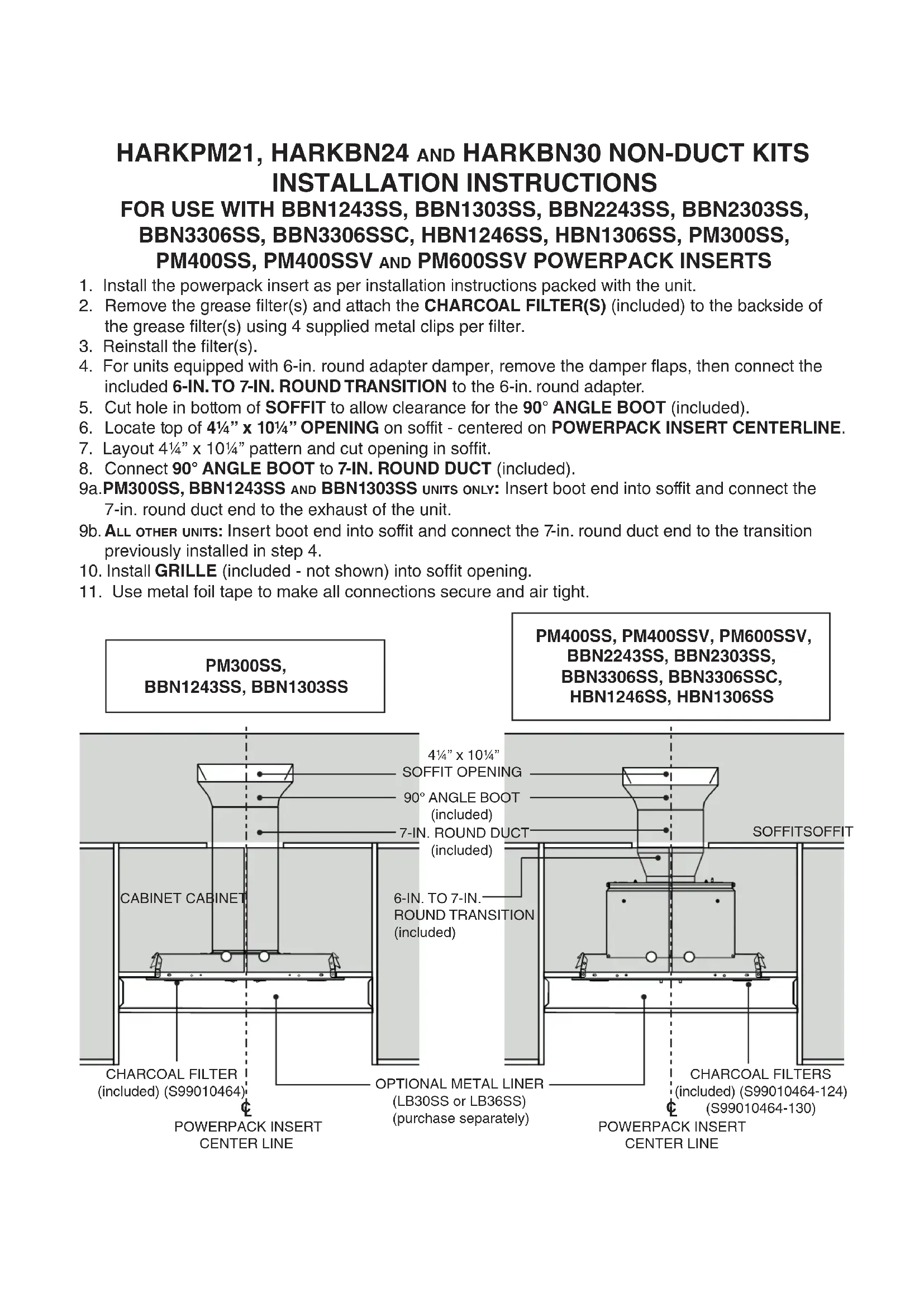 9a.aPPareilS PM300SS, BBN1243SS et BBN1303SS SeuleMeNt : Insérer l’extrémité du raccord dans le soffite et connecter l’extrémité du conduit rond de 7 po à la sortie de la hotte. 9b. touS leS autreS aPPareilS : Insérer l’extrémité du raccord dans le soffite et connecter l’extrémité du conduit rond de 7 po à la transition installée précédemment à l’étape 4.