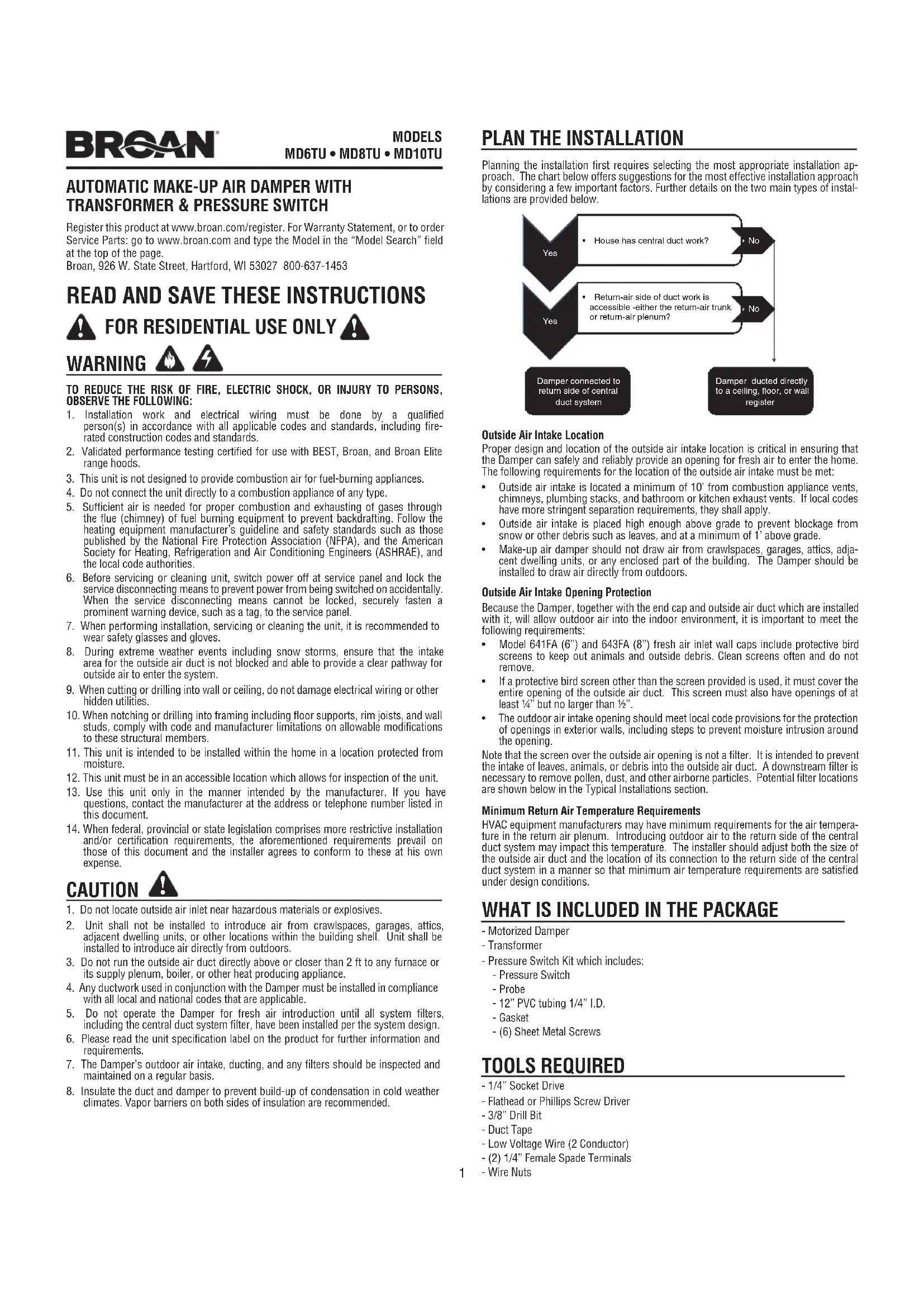 - Clapet motorisé- Transformateur- Ensemble de manocontacteur, incluant : - Manocontacteur - Sonde - Tube PVC 6 mm (1/4 po) D.I. de 30 cm (12 po) - Joint - (6) Vis à tôle OUTILS REQUIS - Clé à cliquet à prise 1/4 po - Tournevis plat ou cruciforme- Mèche 3/8 po- Ruban pour conduit- Fil à basse tension (2 conducteurs)- (2) Cosses ouvertes femelles 1/4 po- Serre-filsEnregistrez ce produit sur www.broan.ca/register. Pour la déclaration de garantie ou pour commander des pièces de rechange: allez sur www.broan.ca et tapez le modèle dans le champ “Recherche Modèle# :” en haut de la page.Broan, 926 W. State Street, Hartford, WI 53027 800-637-14536 Clapet et conduit extérieur raccordés directement au registre d’un plafond, d’un mur ou d’un plancher. MUR INTÉRIEURREGISTRE MURALREGISTRE À FILTRE COULISSANT (facultatif)CLAPET MOTORISÉCAPUCHON MURAL AVEC GRILLAGE AVIAIRECONDUIT D’AIR EXTÉRIEUR ISOLÉ(pente vers le capuchon mural)MUR EXTÉRIEURPRISE D’AÉRATION (située loin des sources de polluant) INSTALLATIONS TYPE Les installations varieront en fonction de l’emplacement de l’appareil dans la maison et du modèle de clapet utilisé. Consultez les illustrations et notes ci-dessous pour vous guider dans l’installation. Respectez toujours les exigences des codes dans toute situation où un détail indiqué ci-dessous contredirait les codes locaux. Ceux-ci ont préséance. Clapet raccordé à la section de retour d’air du conduit central. APPAREIL DE TRAITEMENTDE L’AIRVENTILATEUR DE DISTRIBUTION D’AIRTHERMOSTATDISTRIBUTION D’AIR DU SYSTÈME CENTRALREGISTRE À FILTRE COULISSANT (facultatif)CLAPET AUTO. D'AIR DE COMPENSATIONMESURE DE LA PRESSION D’AIR EXTÉRIEUR. (Consultez la section « Installation du clapet » à la page 12 pour les directives d’équilibrage du clapet.)CAPUCHON MURAL D’ARRIVÉE D’AIR AVEC GRILLAGE AVIAIRECONDUIT D’AIR EXTÉRIEUR ISOLÉ(pente vers le capuchon mural)MUR EXTÉRIEURPRISE D’AÉRATION (située loin des sources de polluant)RETOUR D’AIR DU SYSTÈME CENTRALFILTRE DE L’APPAREIL DE CHAUFFAGE