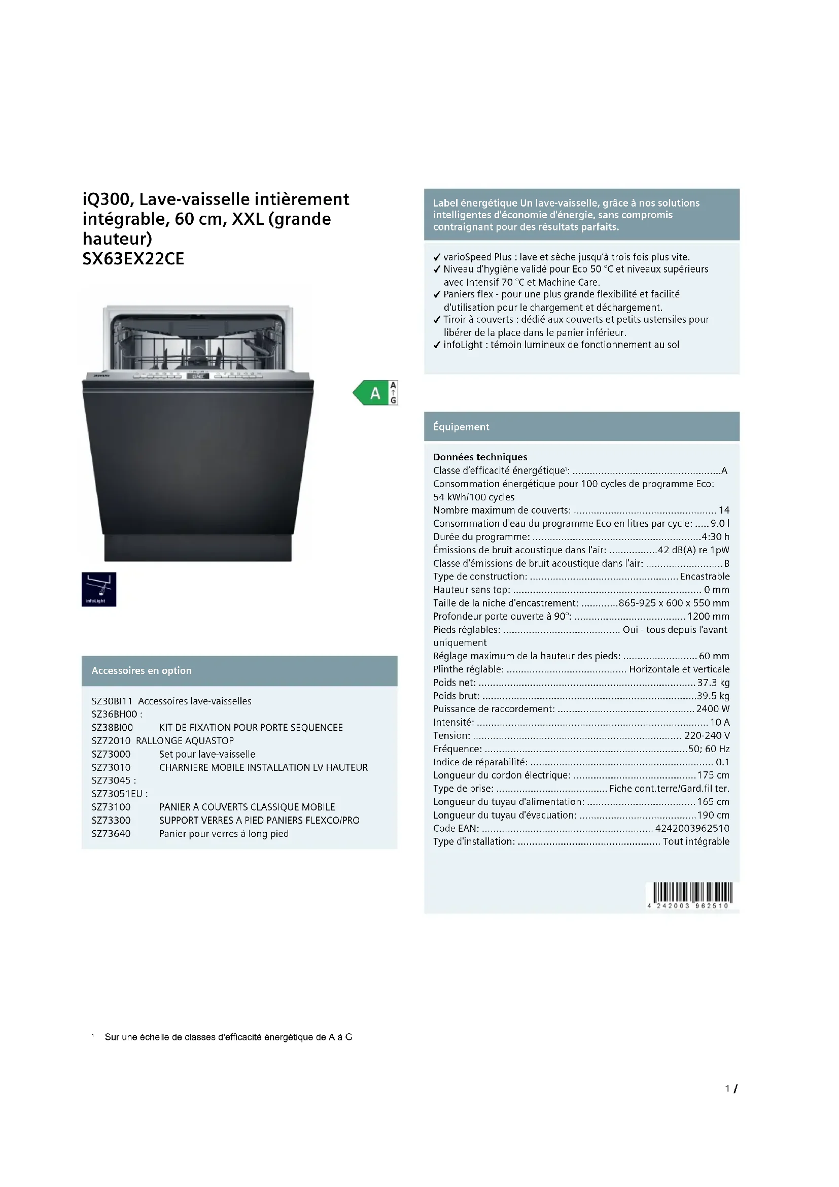 Sur une échelle de classes d'efficacité énergétique de A à G 1 /iQ300, Lave-vaisselle intièrement intégrable, 60 cm, XXL (grande hauteur) SX63EX22CE Équipement Puissance et consommation