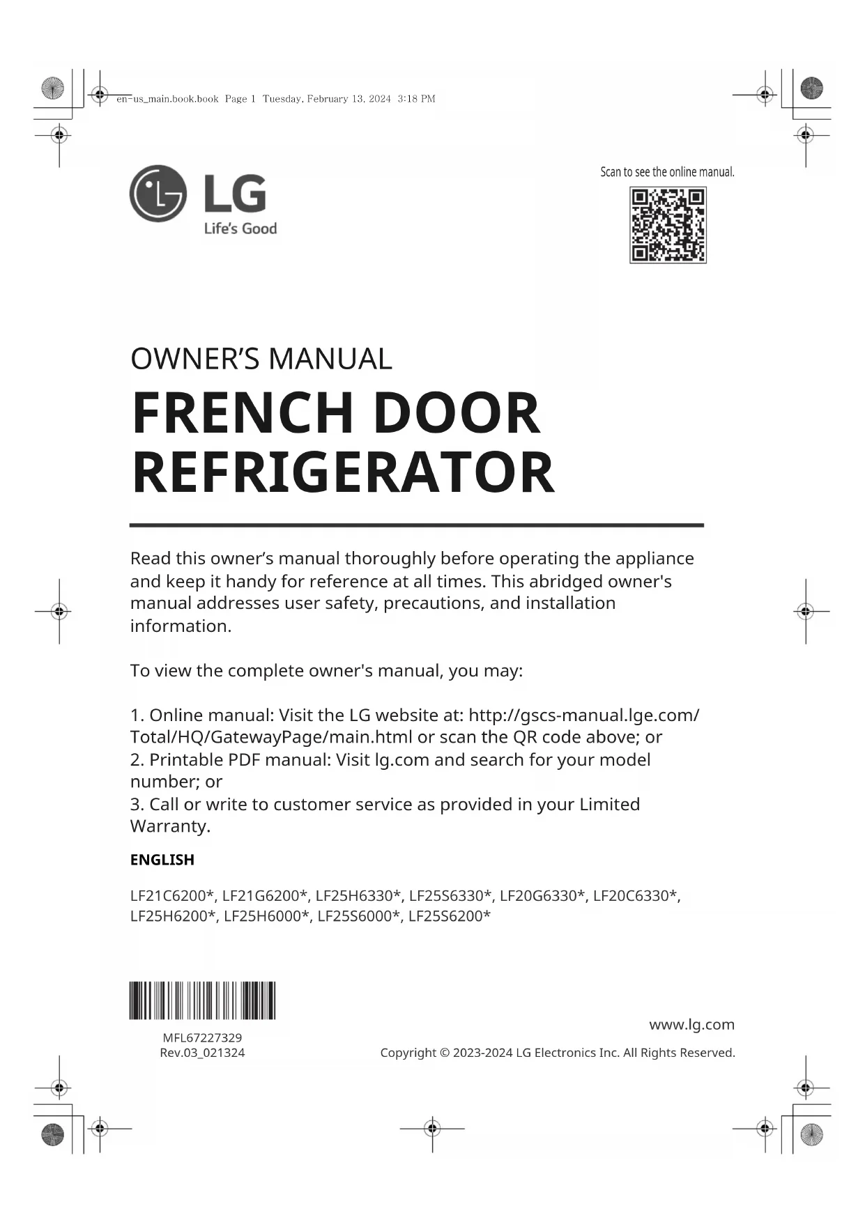 DEUX BATTANTS FRANÇAIS LF21C6200*, LF21G6200*, LF25H6330*, LF25S6330*, LF20G6330*, LF20C6330*, LF25H6200*, LF25H6000*, LF25S6000*, LF25S6200* www.lg.com Copyright © 2023-2024 LG Electronics Inc. Tous droits réservés Balayez le code QR pour consulter le manuel. Veuillez lire soigneusement le présent manuel d'utilisation avant de faire fonctionner l'appareil et conservez-le à portée de la main pour le consult- er en tout temps. Cette version abrégée traite d'avis sécuritaires pour l'utilisateur, précautions et informations d'installation. Pour consulter le manuel intégral, vous pouvez :
