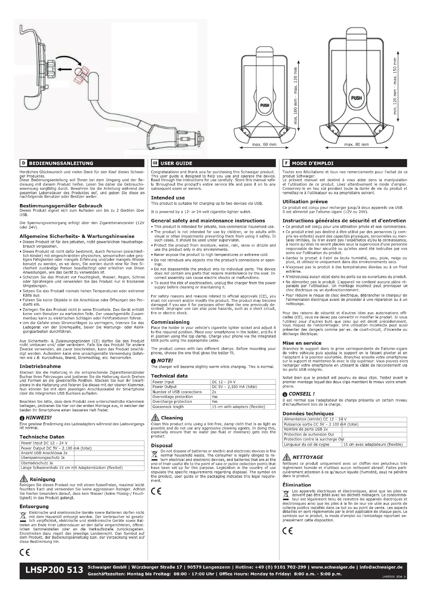- Ce produit est conçu pour une utilisation privée et non commerciale.• Ce produit n’est pas destiné à être utilisé par des personnes (y com pris les enfants) ayant des capacités physiques, sensorielles ou men-tales limitées, ou n‘en ayant pas l‘expérience et/ou la connaissance, à moins qu‘elles ne soient placées sous la supervision d‘une personne responsable de leur sécurité ou qu‘elles aient été instruites par vos soins sur l‘utilisation du produit.• Gardez le produit à l‘abri de toute humidité, eau, pluie, neige ou pluie, et utilisez-le uniquement dans des environnements secs.• N‘exposez pas le produit à des températures élevées ou à un froid extrême.• N‘introduisez aucun objet dans les ports ou les ouvertures du produit.• Ne démontez pas le produit. L‘appareil ne contient aucune pièce ré parable par l‘utilisateur. Un montage incorrect peut provoquer un choc électrique ou un dysfonctionnement.• Pour réduire le risque de choc électrique, débrancher le chargeur de l‘alimentation électrique avant de procéder à une réparation ou à un nettoyage.Pour des raisons de sécurité et d‘autres liées aux autorisations offi cielles (CE), vous ne devez pas convertir ni modifier le produit. Si vous l‘utilisez pour d‘autres buts que celui qui est décrit précédemment, vous risquez de l‘endommager. Une utilisation incorrecte peut aussi présenter des dangers comme par ex. de court-circuit, d‘incendie ou décharge électrique. Mise en service Branchez le support dans la prise correspondante de l‘allume-cigare de votre véhicule puis ajustez le support en le faisant pivoter et en l‘adaptant à la position souhaitée. Branchez ensuite votre smartphone sur le support et maintenez-le avec le clip supérieur. Vous pouvez alors recharger votre smartphone en utilisant le câble de raccordement via les ports USB intégrés.Notez bien que le produit est pourvu de deux clips. Testez avant le premier montage lequel des deux clips maintient le mieux votre smart phone. CONSEIL ! Il est normal que l‘adaptateur de charge présente un certain niveau d‘échauffement lors de la charge. Données techniques Alimentation (entrée) CC 12 – 24 VPuissance sortie CC 5V – 2 100 mA (total)Nombre de ports USB 2xProtection de surtension OuiProtection contre la surcharge OuiLongueur du col de cygne 15 cm avec adaptateurs (flexible) NETTOYAGE Nettoyez ce produit uniquement avec un chiffon non pelucheux très légèrement humide et n‘utilisez aucun nettoyant abrasif. Faites parti culièrement attention à ce qu‘aucun liquide (humidité, eau) ne pénètre dans le produit. Élimination Les appareils électriques et électroniques, ainsi que les piles ne doivent pas être jetés avec les déchets ménagers. Le consomma teur est légalement tenu de remettre les appareils électriques et électroniques ainsi que les piles à la fin de leur vie utile aux points de collecte publics installés dans ce but ou au point de vente. Les aspects détaillés en sont réglementés par le droit applicable de chaque pays. Le symbole sur le produit, le mode d’emploi ou l’emballage reportent ex pressément cette disposition. Congratulations and thank you for purchasing this Schwaiger product. This user guide is designed to help you use and operate the device. Read through the instructions for use carefully. Store this manual safe ly throughout the product‘s entire service life and pass it on to any subsequent users or owners. Intended use This product is suitable for charging up to two devices via USB. It is powered by a 12- or 24-volt cigarette-lighter outlet. General safety and maintenance instructions
