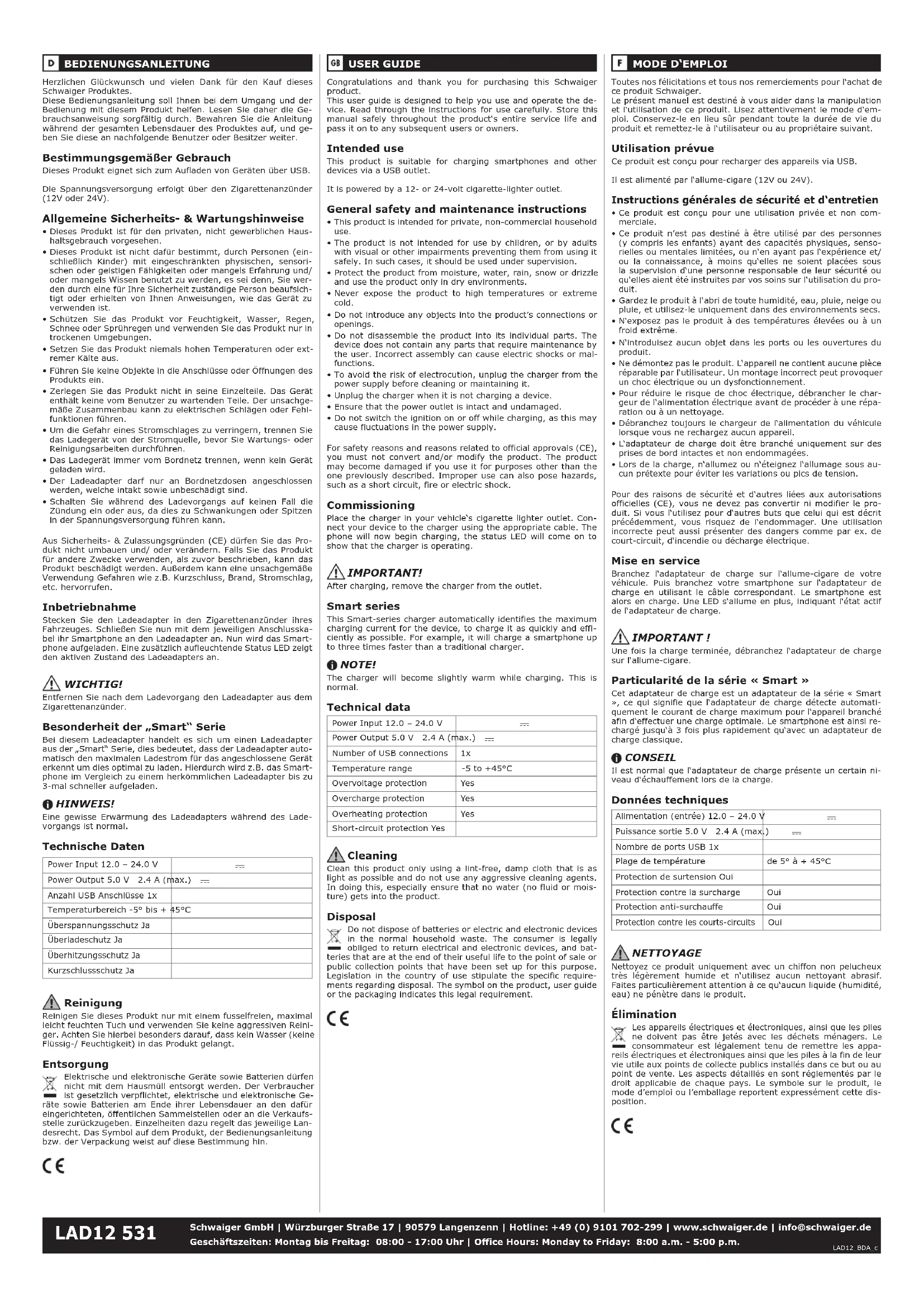 - Lors de la charge, n‘allumez ou n‘éteignez l‘allumage sous au- cun prétexte pour éviter les variations ou pics de tension. Pour des raisons de sécurité et d‘autres liées aux autorisations officielles (CE), vous ne devez pas convertir ni modifier le pro- duit. Si vous l‘utilisez pour d‘autres buts que celui qui est décrit précédemment, vous risquez de l‘endommager. Une utilisation incorrecte peut aussi présenter des dangers comme par ex. de court-circuit, d‘incendie ou décharge électrique. Mise en service Branchez l‘adaptateur de charge sur l‘allume-cigare de votre véhicule. Puis branchez votre smartphone sur l‘adaptateur de charge en utilisant le câble correspondant. Le smartphone est alors en charge. Une LED s‘allume en plus, indiquant l‘état actif de l‘adaptateur de charge. IMPORTANT ! Une fois la charge terminée, débranchez l‘adaptateur de charge sur l‘allume-cigare. Particularité de la série « Smart » Cet adaptateur de charge est un adaptateur de la série « Smart », ce qui signifie que l‘adaptateur de charge détecte automati- quement le courant de charge maximum pour l‘appareil branché afin d‘effectuer une charge optimale. Le smartphone est ainsi re- chargé jusqu‘à 3 fois plus rapidement qu‘avec un adaptateur de charge classique. CONSEIL Il est normal que l‘adaptateur de charge présente un certain ni- veau d‘échauffement lors de la charge. Données techniques Alimentation (entrée) 12.0 – 24.0 V Puissance sortie 5.0 V 2.4 A (max.) Nombre de ports USB 1x Plage de température de 5° à + 45°C Protection de surtension Oui Protection contre la surcharge Oui Protection anti-surchauffe Oui Protection contre les courts-circuits Oui NETTOYAGE Nettoyez ce produit uniquement avec un chiffon non pelucheux très légèrement humide et n‘utilisez aucun nettoyant abrasif. Faites particulièrement attention à ce qu‘aucun liquide (humidité, eau) ne pénètre dans le produit. Élimination Les appareils électriques et électroniques, ainsi que les piles ne doivent pas être jetés avec les déchets ménagers. Le consommateur est légalement tenu de remettre les appa- reils électriques et électroniques ainsi que les piles à la fin de leur vie utile aux points de collecte publics installés dans ce but ou au point de vente. Les aspects détaillés en sont réglementés par le droit applicable de chaque pays. Le symbole sur le produit, le mode d’emploi ou l’emballage reportent expressément cette dis- position. Congratulations and thank you for purchasing this Schwaiger product. This user guide is designed to help you use and operate the de- vice. Read through the instructions for use carefully. Store this manual safely throughout the product‘s entire service life and pass it on to any subsequent users or owners. Intended use This product is suitable for charging smartphones and other devices via a USB outlet. It is powered by a 12- or 24-volt cigarette-lighter outlet. General safety and maintenance instructions